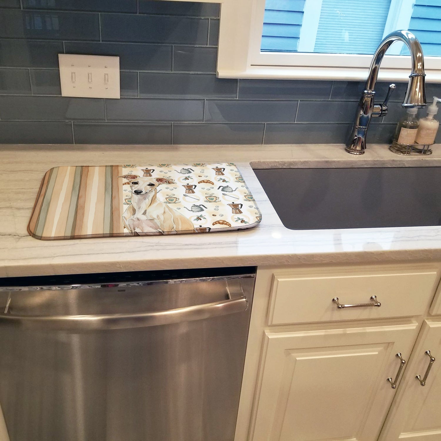 Shown here is the Cream Italian Greyhound Coffee Bar Dish Drying Mat from Caroline's Treasures featuring artwork of a Italian Greyhound in a Everyday design. The detailed illustration and vibrant colors make it a standout accent that celebrates both seasonal style and love for the subject. This image features a cozy watercolor coffee-themed pattern with illustrated mugs, moka pots, kettles, croissants, coffee beans, and sugar cubes arranged in a repeating design. Soft neutral tones with warm browns, creams, and subtle sage accents create an inviting, café-inspired look that feels comforting and relaxed. Everyday décor celebrates personal style and the small moments that make a house feel like home. Thoughtful designs add warmth and personality that can be enjoyed year-round. Say goodbye to messy countertops and soggy dish towels with our innovative dish drying mat. Our high-quality dish drying pad is designed to keep your countertops dry while offering a stylish and efficient solution. Whether you're air drying dishes, glasses, stemware, silverware, pots, pans, bottles, or even fruits and vegetables, our dish mat is the perfect choice. The 14 inches x 21 inches size fits most counters and dish drying racks, and the non-slip design ensures stability. Made with water-absorbent polyester and a polyurethane foam insert, our dish drying mat is not only functional but also durable. It's machine washable and printed in the USA for long-lasting use. The beautiful artwork adds flair to your kitchen decor, making it a perfect housewarming gift or present for any occasion. Upgrade your kitchen experience with our absorbent and versatile dish drying mat. Perfect for: Kitchen counters and sinks, everyday dish drying and countertop protection, Dogs-themed homes, or year-round use for Italian Greyhound lovers. Italian Greyhounds are graceful companion dogs known for their slender build and affectionate nature. This elegant breed is cherished for its sensitivity, loyalty, and love of comfort. Makes a heartfelt gift for: Italian Greyhound owners, Dogs lovers, Everyday gifts, pet parents, friends who adore their Italian Greyhound, or anyone celebrating Dogs.