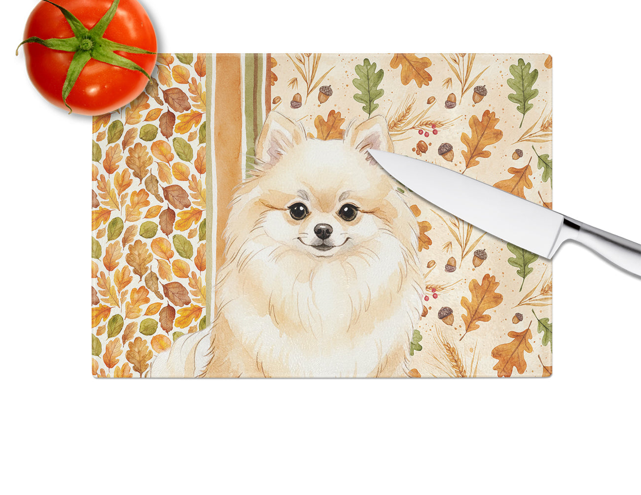 Glass Cutting Board featuring breed specific Pomeranian artwork. Celebrate Thanksgiving with this Thanksgiving Cutting Board. Introduce your kitchen to the vibrant, large Decorative Glass Cutting Board from Caroline's Treasures. Crafted from resilient tempered glass, this board is not only a utilitarian necessity but also a colorful art piece. With its generous dimensions of 15 inches in height and 12 inches in length, it offers ample space for all your cutting needs. Every piece showcases captivating artwork from distinguished artists, bringing an aesthetic edge to your kitchen. Beyond its attractive design, this cutting board ensures your countertop stays pristine and unscathed, owing to its heat-resistant properties. Engineered with user convenience in mind, it features non-skid feet for stability, and rounded corners for additional safety. Its robust construction renders it virtually unbreakable, guaranteeing longevity. The board comes with protective feet bumpers, maintaining its position during use. This product is recommended to be hand washed only. Proudly printed and assembled in the United States, this cutting board exemplifies superior craftsmanship. With Caroline's Treasures' Decorative Glass Cutting Board, you're investing in a blend of functionality and artistic flair.