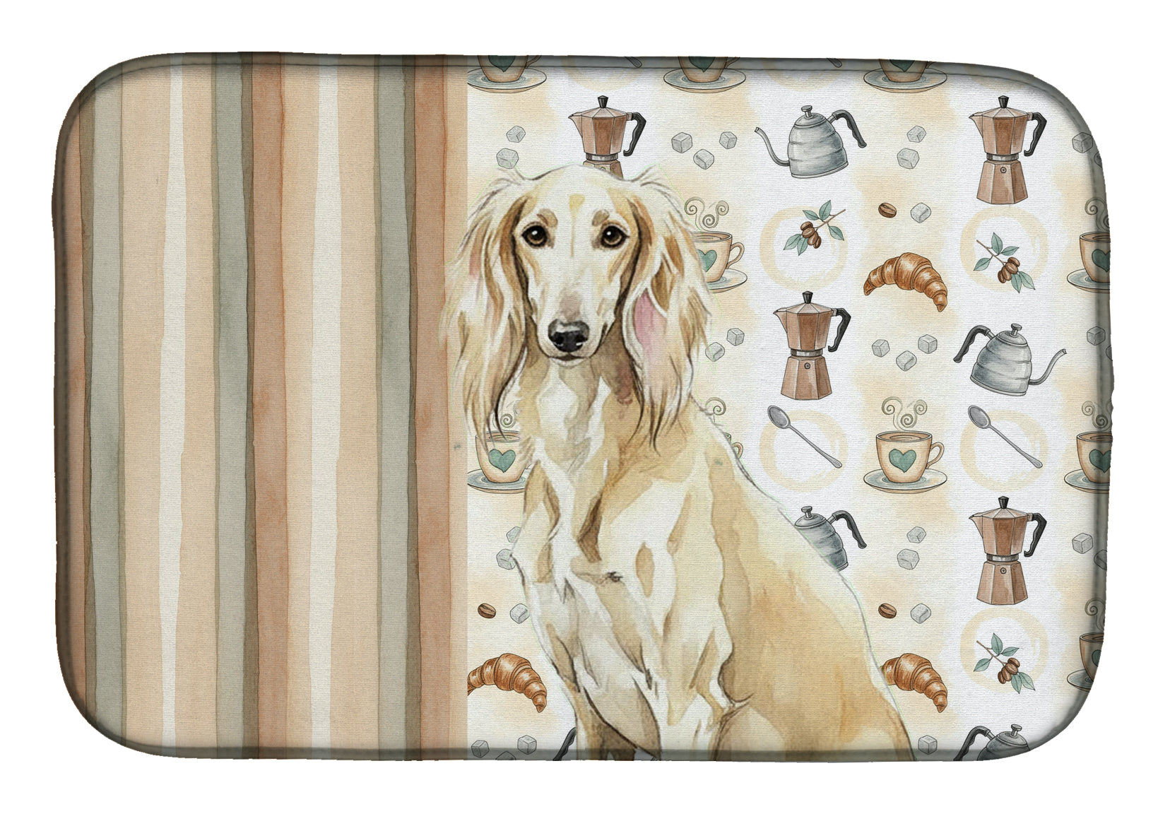 Shown here is the Cream Saluki Coffee Bar Dish Drying Mat from Caroline's Treasures featuring artwork of a Saluki in a Everyday design. The detailed illustration and vibrant colors make it a standout accent that celebrates both seasonal style and love for the subject. This image features a cozy watercolor coffee-themed pattern with illustrated mugs, moka pots, kettles, croissants, coffee beans, and sugar cubes arranged in a repeating design. Soft neutral tones with warm browns, creams, and subtle sage accents create an inviting, café-inspired look that feels comforting and relaxed. Everyday décor celebrates personal style and the small moments that make a house feel like home. Thoughtful designs add warmth and personality that can be enjoyed year-round. Say goodbye to messy countertops and soggy dish towels with our innovative dish drying mat. Our high-quality dish drying pad is designed to keep your countertops dry while offering a stylish and efficient solution. Whether you're air drying dishes, glasses, stemware, silverware, pots, pans, bottles, or even fruits and vegetables, our dish mat is the perfect choice. The 14 inches x 21 inches size fits most counters and dish drying racks, and the non-slip design ensures stability. Made with water-absorbent polyester and a polyurethane foam insert, our dish drying mat is not only functional but also durable. It's machine washable and printed in the USA for long-lasting use. The beautiful artwork adds flair to your kitchen decor, making it a perfect housewarming gift or present for any occasion. Upgrade your kitchen experience with our absorbent and versatile dish drying mat. Perfect for: Kitchen counters and sinks, everyday dish drying and countertop protection, Dogs-themed homes, or year-round use for Saluki lovers. Salukis are elegant sighthounds known for their speed and graceful build. This ancient breed is admired for its independence, intelligence, and quiet dignity. Makes a heartfelt gift for: Saluki owners, Dogs lovers, Everyday gifts, pet parents, friends who adore their Saluki, or anyone celebrating Dogs.