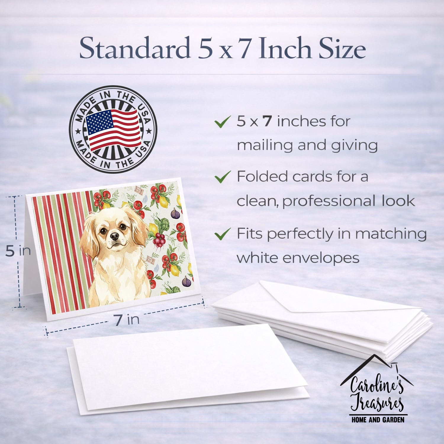 Shown here is the Cream Tibetan Spaniel Vegetables Greeting Cards Pack of 8 from Caroline's Treasures featuring artwork of a Tibetan Spaniel in a Everyday design. The detailed illustration and vibrant colors make it a standout accent that celebrates both seasonal style and love for the subject. This image features a vibrant watercolor vegetable pattern with tomatoes, lemons, artichokes, figs, radishes, and leafy greens arranged in a repeating design, paired with classic red and green stripes. The bright, garden-fresh palette creates a cheerful, farmhouse-inspired look that feels lively, welcoming, and perfect for kitchen décor. Everyday décor celebrates personal style and the small moments that make a house feel like home. Thoughtful designs add warmth and personality that can be enjoyed year-round. Celebrate special moments with Caroline's Treasures Printed Greeting Card Pack. This pack includes eight beautifully folded 5x7 cards, accompanied by eight matching white envelopes. With blank interiors, these cards provide ample space for your personalized messages and heartfelt holiday greetings. Each card features captivating full-color artwork, meticulously printed in our facility on high-quality 80 lb cover stock or 216 GSM. The super smooth finish of the white cards enhances the visual impact of the artwork, creating a truly stunning presentation. Designed by our talented in-house artists or licensed artists, the artwork on these cards showcases their creativity and attention to detail. From vibrant illustrations to captivating designs, each card tells its own unique story. Whether it's for birthdays, anniversaries, holidays, or any special occasion, Caroline's Treasures Greeting Card Pack is the perfect way to convey your heartfelt sentiments. Share joy, love, and warm wishes with these exquisite cards and make every moment unforgettable. Perfect for: Writing personal messages, everyday correspondence, and thoughtful notes, Dogs-themed stationery collections, or year-round use for Tibetan Spaniel lovers. Tibetan Spaniels are small companion dogs known for their intelligence and alert nature. This breed is cherished for its loyalty, independence, and affectionate personality. Makes a heartfelt gift for: Tibetan Spaniel owners, Dogs lovers, Everyday gifts, pet parents, friends who adore their Tibetan Spaniel, or anyone celebrating Dogs.