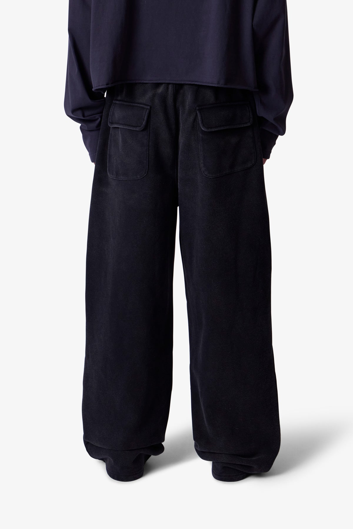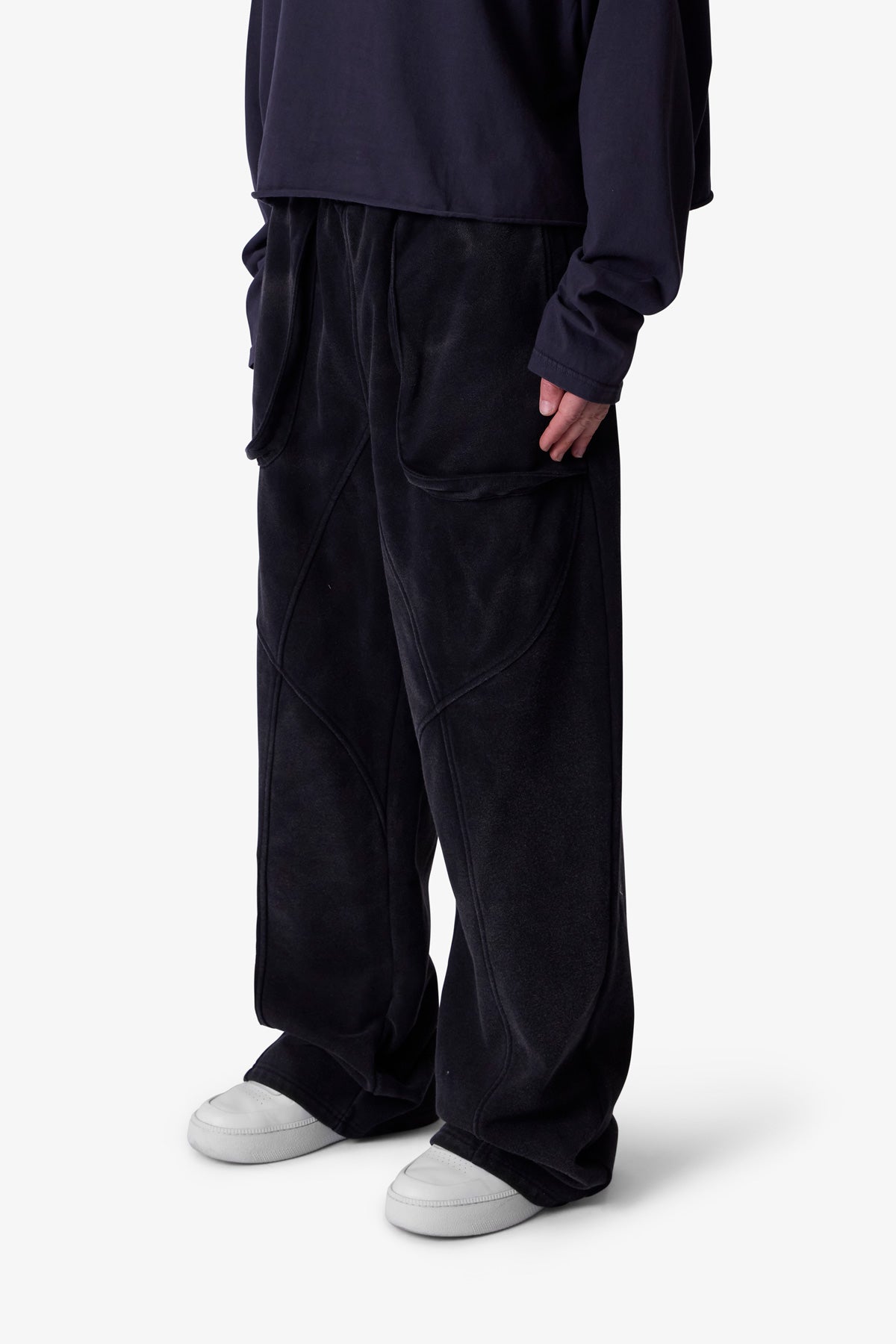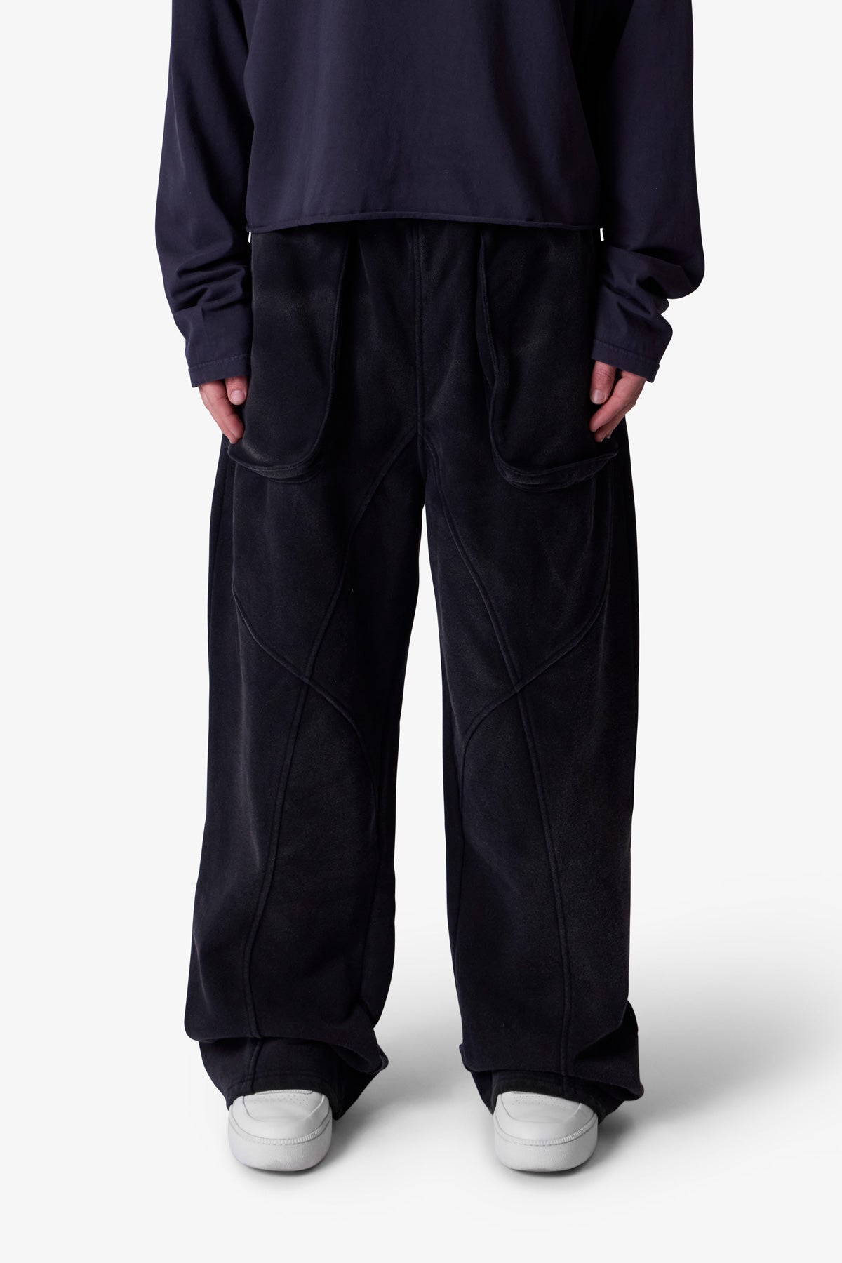 the Cross Seamed Sweatpants features a baggy fit with gusseted patch pockets at the waist, elasticized self at the waist, finished seam details throughout, and finished in both a washed and brushed fleece fabric.