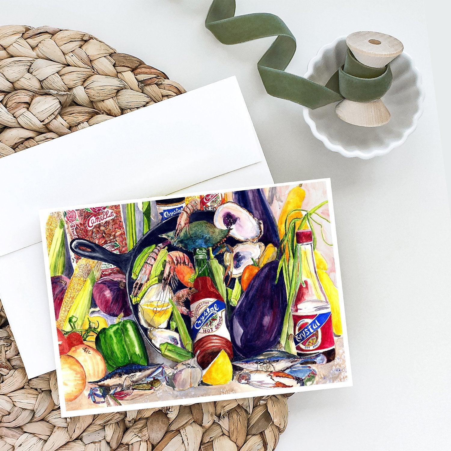 Crystal Hot Sauce with Camellia Beans and Black Skillet Greeting Cards -  Blank Note Cards – 8-Pack of Artist-Designed Cards with Envelopes