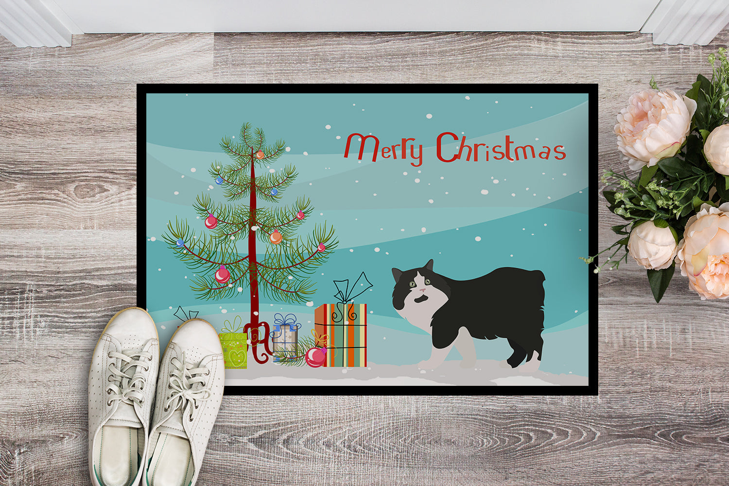 Decorate your space with our Christmas Cymric artwork on a Doormat. Welcome your guests in style with our Artwork Door Mat, designed to withstand almost any weather condition. This mat, measuring approximately 18 by 27 inches, is held together by durable black binding tape. Its top layer, composed of polyester felt, is dyed with the eye-catching image you see on the mat. A few layers below provide the mat with stability, while its rubber bottom is stamped to help prevent slipping and ensures safety. Our mat works wonderfully as both an indoor or outdoor door mat. For cleaning, simply hose it off with water or use a power washer - no need for any cleaner that produces suds. Avoid scrubbing with a brush, instead, opt for the vacuum on floor setting. Designed manufactured and printed in the USA, this mat is a perfect addition to your porch, outdoor kitchen, entryway, or any indoor space. Its unique design makes it a charming decorative rug that greets your guests and adds a stylish touch to your home decor.