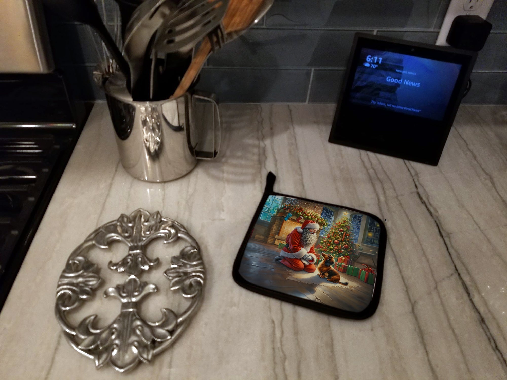 Pair of Pot Holders featuring breed specific Dachshund artwork. Celebrate Christmas with this Christmas Pair of Pot Holders. A Pair of Pot Holders to match your kitchen decor. Made in the USA these are thick and functional. Full color artwork decorates the front polyester fabric of the hot pad and accented by a black trim. Use these at as a trivet for your Thanksgiving or Christmas tablescape. Filled with insulated fabric and quilted for durability. These colorful pot holders will make a great gift for your favorite home cook or executive chef. Each pot holder measures approximately 7 1/2 inches by 7 1/2 inches. A hanging tab is included.