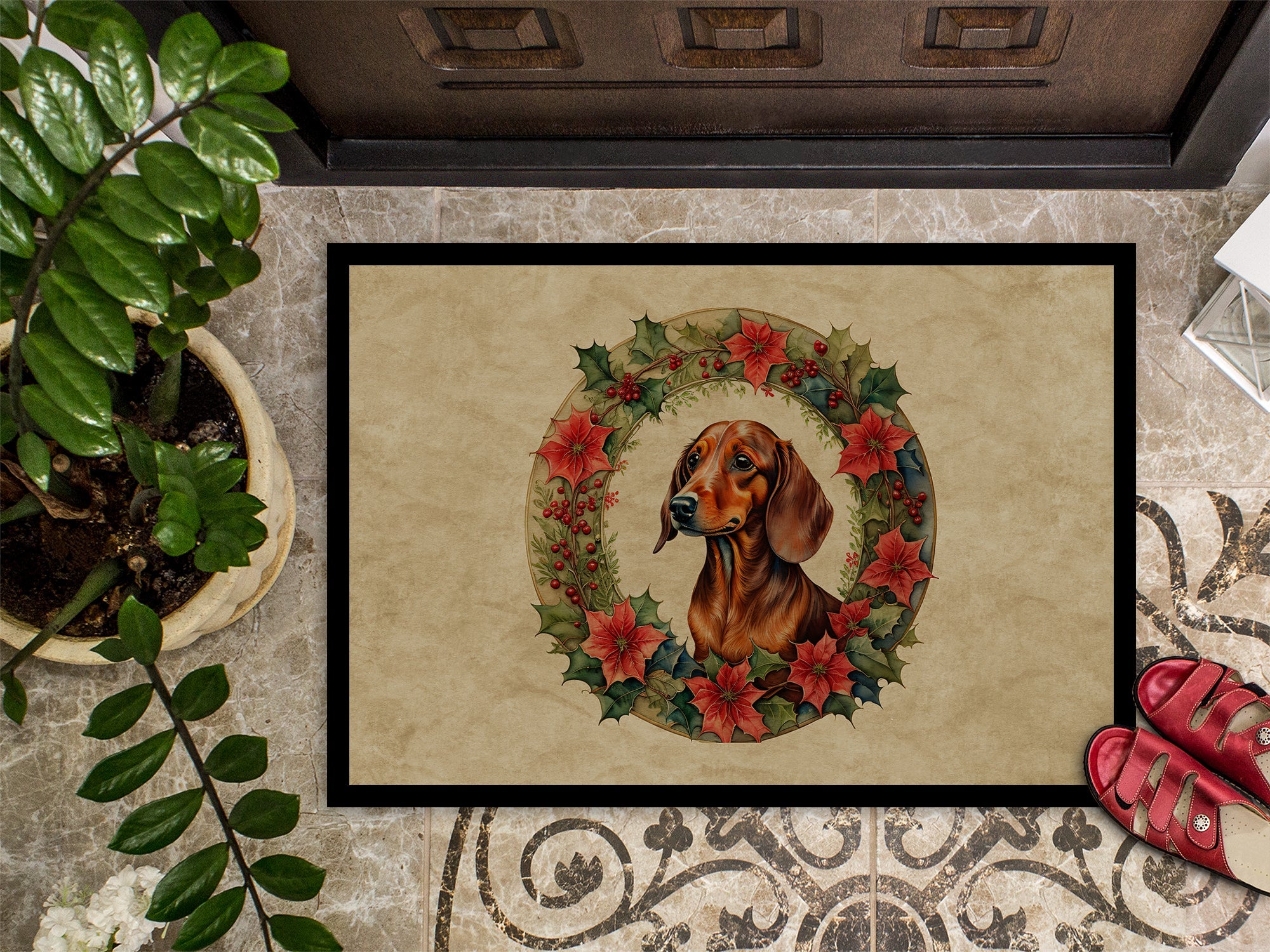 Decorate your space with our Christmas Dachshund artwork on a Doormat. Bring a bit of Winter into your home with a Winter Doormat. Welcome your guests in style with our Artwork Door Mat, designed to withstand almost any weather condition. This mat, measuring approximately 18 by 27 inches, is held together by durable black binding tape. Its top layer, composed of polyester felt, is dyed with the eye-catching image you see on the mat. A few layers below provide the mat with stability, while its rubber bottom is stamped to help prevent slipping and ensures safety. Our mat works wonderfully as both an indoor or outdoor door mat. For cleaning, simply hose it off with water or use a power washer - no need for any cleaner that produces suds. Avoid scrubbing with a brush, instead, opt for the vacuum on floor setting. Designed manufactured and printed in the USA, this mat is a perfect addition to your porch, outdoor kitchen, entryway, or any indoor space. Its unique design makes it a charming decorative rug that greets your guests and adds a stylish touch to your home decor.