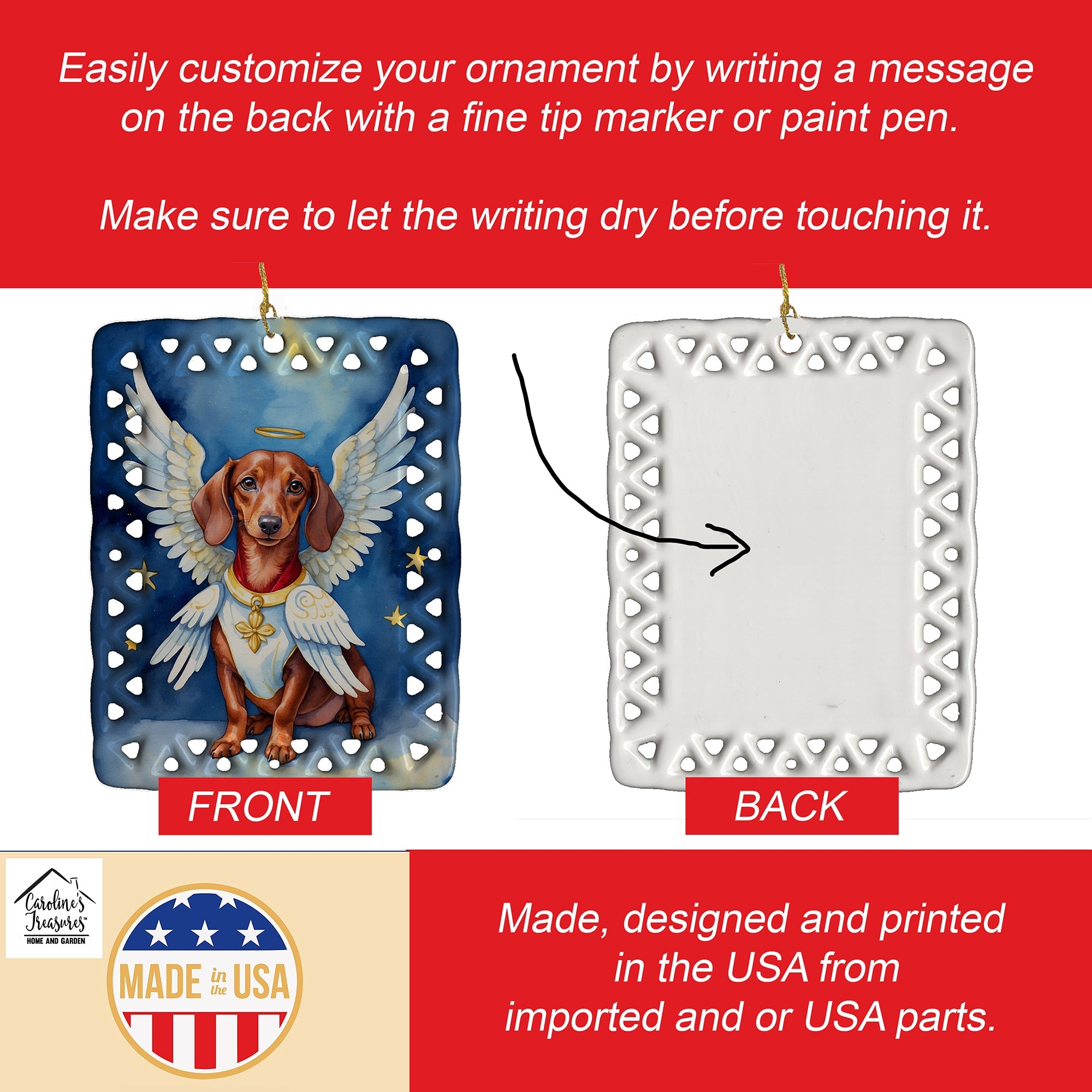 Porcelain Ornament featuring breed specific Dachshund artwork. Celebrate Christmas with this Christmas Ornament. Add a unique, personal touch to your holiday decor with our Rectangular Lattice Porcelain Ornament. Perfect for creating cherished memories, this high-quality ornament shines under festive lights, reflecting warmth and joy throughout your Christmas tree. Crafted with a glossy finish, it showcases vibrant, full-color artwork contributed by our talented artists, ensuring your tree is adorned with a burst of color and holiday spirit. What sets this Porcelain Ornament apart is its customizable white back. Use a paint pen or permanent marker to write a heartfelt message, commemorate a special year, or mark an unforgettable date, turning this ornament into a keepsake that will be treasured for years to come. For best results, allow any personalization to dry thoroughly before handling. Each ornament comes complete with a delicate gold cord, making it easy to hang and display. Proudly made in the USA, this ornament measures 3.375 x 2.625 inches and is a thoughtful gift for pet sitters, teachers, family members, or anyone who would appreciate a little extra holiday magic. Bring style, charm, and a touch of personal meaning to your Christmas tree with this beautifully designed ornament..