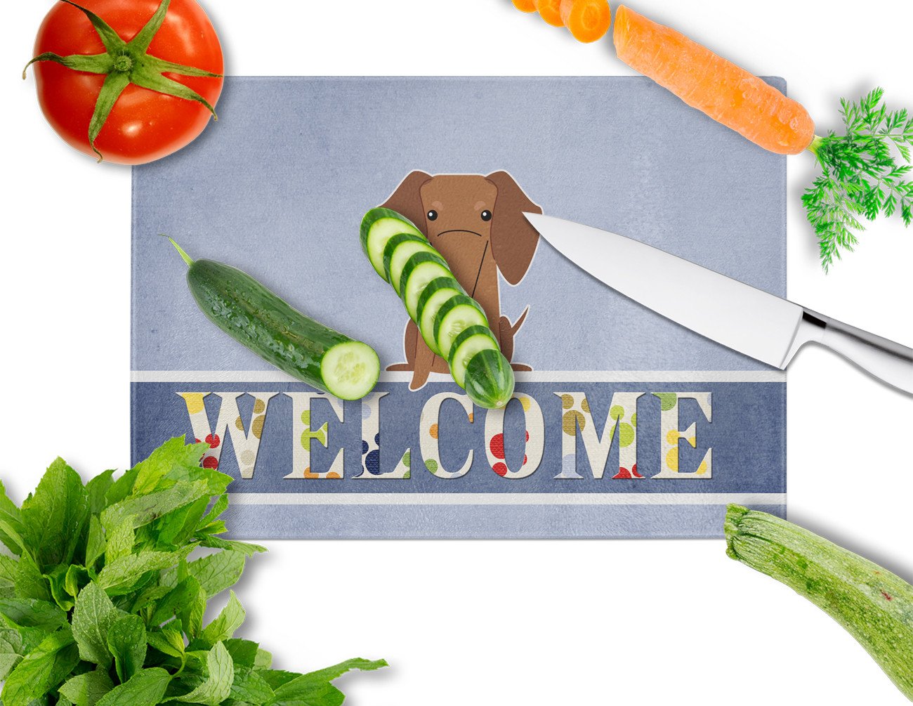 Decorate your space with our Dachshund artwork on a Cutting Board. Introduce your kitchen to the vibrant, large Decorative Glass Cutting Board from Caroline's Treasures. Crafted from resilient tempered glass, this board is not only a utilitarian necessity but also a colorful art piece. With its generous dimensions of 15 inches in height and 12 inches in length, it offers ample space for all your cutting needs. Every piece showcases captivating artwork from distinguished artists, bringing an aesthetic edge to your kitchen. Beyond its attractive design, this cutting board ensures your countertop stays pristine and unscathed, owing to its heat-resistant properties. Engineered with user convenience in mind, it features non-skid feet for stability, and rounded corners for additional safety. Its robust construction renders it virtually unbreakable, guaranteeing longevity. The board comes with protective feet bumpers, maintaining its position during use. This product is recommended to be hand washed only. Proudly printed and assembled in the United States, this cutting board exemplifies superior craftsmanship. With Caroline's Treasures' Decorative Glass Cutting Board, you're investing in a blend of functionality and artistic flair.