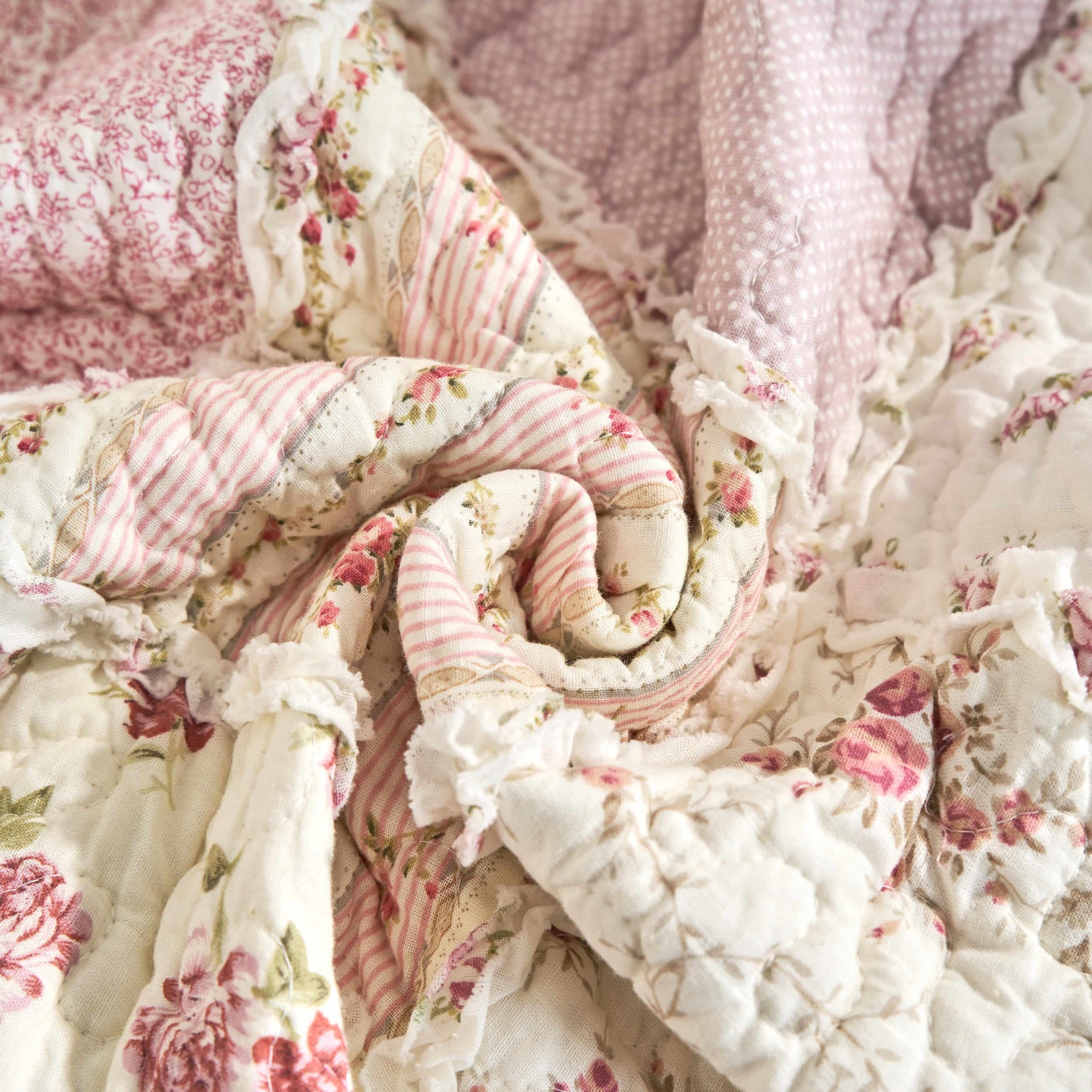 Vintage Charm: This quilted reversible throw blanket exudes timeless shabby chic flair with its delicate floral designs, pastel blush pink tones, and cream-colored accents.