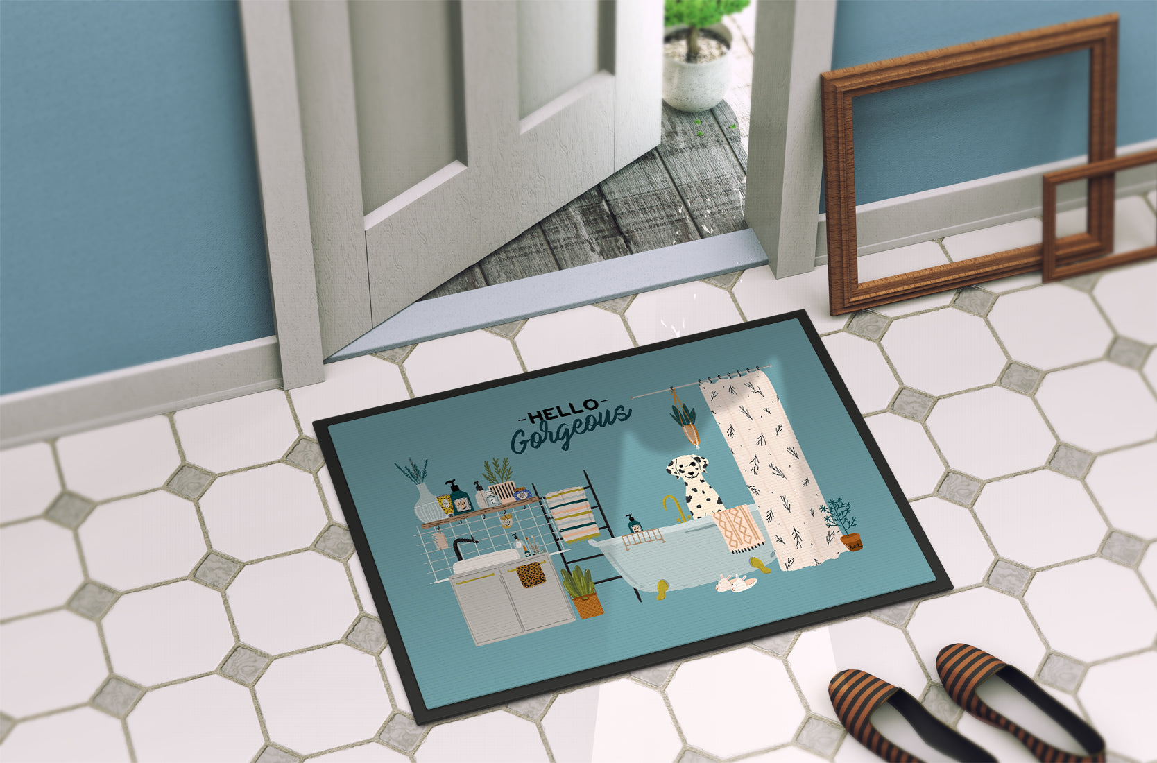 Decorate your space with our Dalmatian artwork on a Doormat. Welcome your guests in style with our Artwork Door Mat, designed to withstand almost any weather condition. This mat, measuring approximately 18 by 27 inches, is held together by durable black binding tape. Its top layer, composed of polyester felt, is dyed with the eye-catching image you see on the mat. A few layers below provide the mat with stability, while its rubber bottom is stamped to help prevent slipping and ensures safety. Our mat works wonderfully as both an indoor or outdoor door mat. For cleaning, simply hose it off with water or use a power washer - no need for any cleaner that produces suds. Avoid scrubbing with a brush, instead, opt for the vacuum on floor setting. Designed manufactured and printed in the USA, this mat is a perfect addition to your porch, outdoor kitchen, entryway, or any indoor space. Its unique design makes it a charming decorative rug that greets your guests and adds a stylish touch to your home decor.