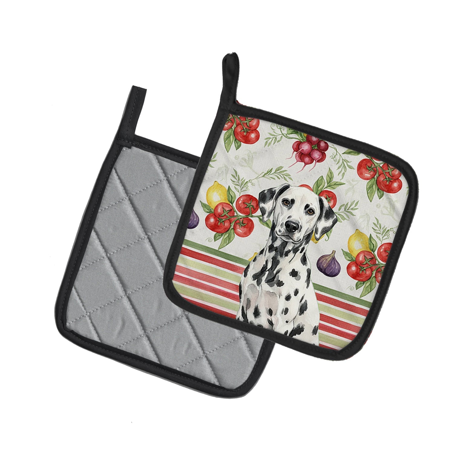 Pair of Pot Holders featuring breed specific Dalmatian artwork. Add warmth, personality, and function to your kitchen with our Vegetables Pot Holder Pair. Each set includes two quilted hot pads, featuring original full-color watercolor artwork on a soft polyester front accented by black trim. Crafted with multiple layers for performance: Top Layer: Vibrant artwork permanently dyed into polyester fabric. Middle Layer: US-manufactured insulated material with breathable polyester fibers and a reflective metalized film that reflects heat back to its source. Bottom Layer: A silver heat-resistant backing for extra protection. Each pot holder measures 7.5" x 7.5", includes a hanging tab, and is quilted for durability. Use them to protect your hands, countertops, and tabletops — or as decorative trivets for Thanksgiving, Christmas, or everyday meals.
