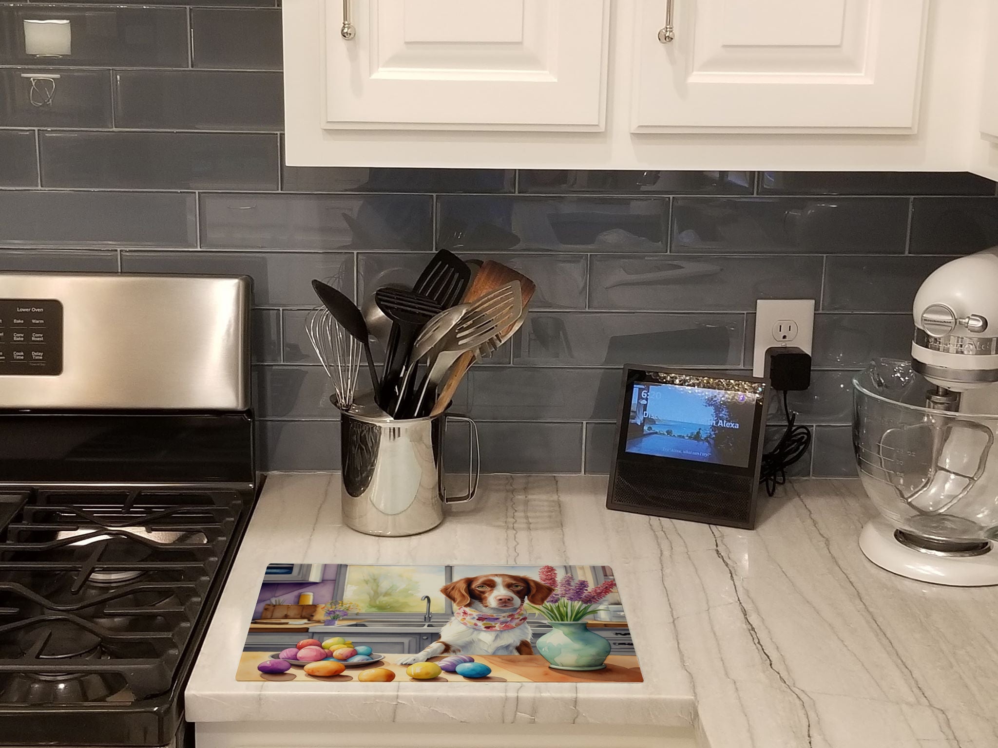 Decorate your space with our Easter Brittany Spaniel artwork on a Cutting Board. Introduce your kitchen to the vibrant, large Decorative Glass Cutting Board from Caroline's Treasures. Crafted from resilient tempered glass, this board is not only a utilitarian necessity but also a colorful art piece. With its generous dimensions of 15 inches in height and 12 inches in length, it offers ample space for all your cutting needs. Every piece showcases captivating artwork from distinguished artists, bringing an aesthetic edge to your kitchen. Beyond its attractive design, this cutting board ensures your countertop stays pristine and unscathed, owing to its heat-resistant properties. Engineered with user convenience in mind, it features non-skid feet for stability, and rounded corners for additional safety. Its robust construction renders it virtually unbreakable, guaranteeing longevity. The board comes with protective feet bumpers, maintaining its position during use. This product is recommended to be hand washed only. Proudly printed and assembled in the United States, this cutting board exemplifies superior craftsmanship. With Caroline's Treasures' Decorative Glass Cutting Board, you're investing in a blend of functionality and artistic flair.