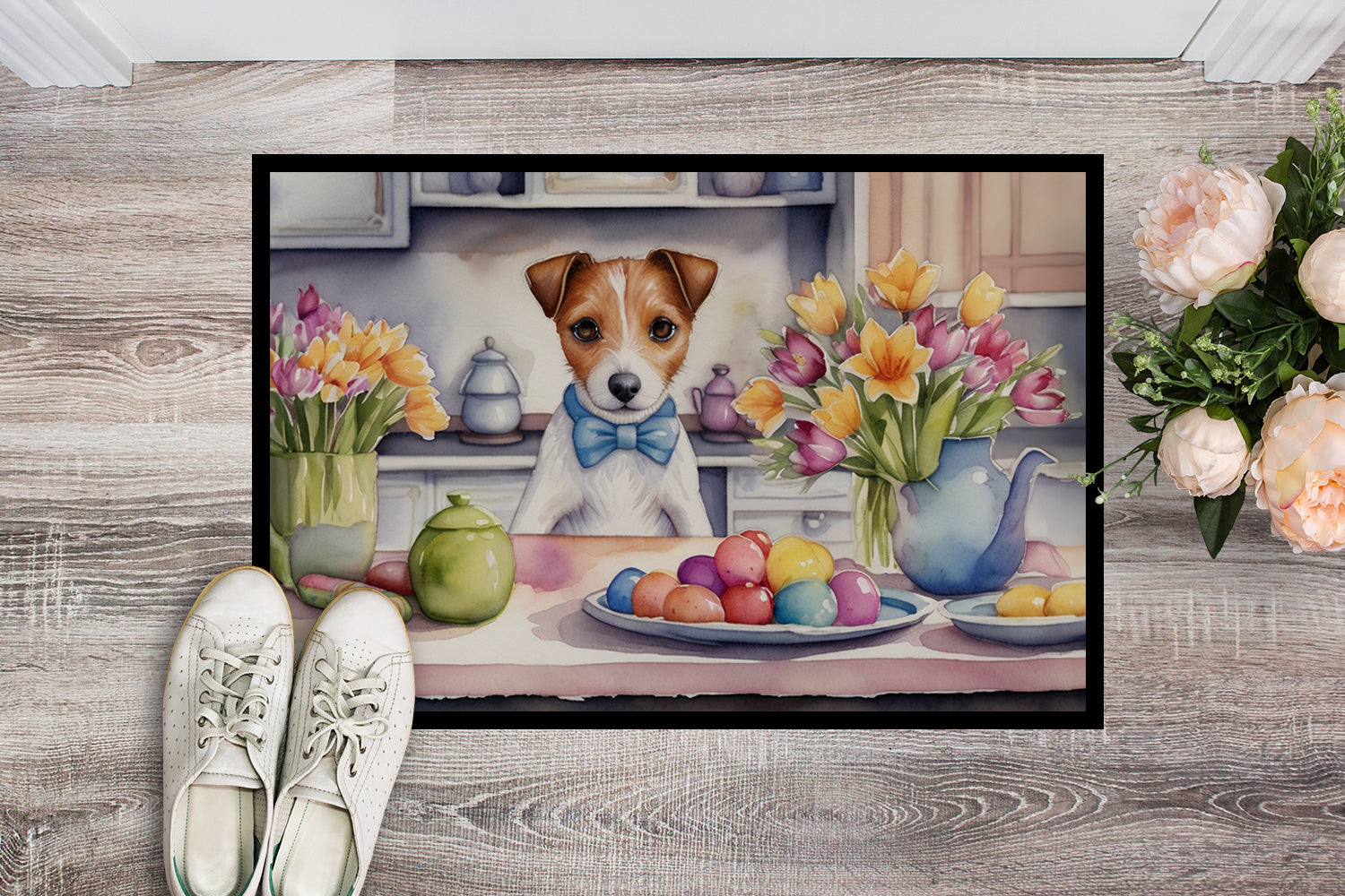 Decorate your space with our Easter Jack Russell Terrier artwork on a Doormat. Welcome your guests in style with our Artwork Door Mat, designed to withstand almost any weather condition. This mat, measuring approximately 24 by 36 inches, is held together by durable black binding tape. Its top layer, composed of polyester felt, is dyed with the eye-catching image you see on the mat. A few layers below provide the mat with stability, while its rubber bottom is stamped to help prevent slipping and ensures safety. Our mat works wonderfully as both an indoor or outdoor door mat. For cleaning, simply hose it off with water or use a power washer - no need for any cleaner that produces suds. Avoid scrubbing with a brush, instead, opt for the vacuum on floor setting. Designed manufactured and printed in the USA, this mat is a perfect addition to your porch, outdoor kitchen, entryway, or any indoor space. Its unique design makes it a charming decorative rug that greets your guests and adds a stylish touch to your home decor.