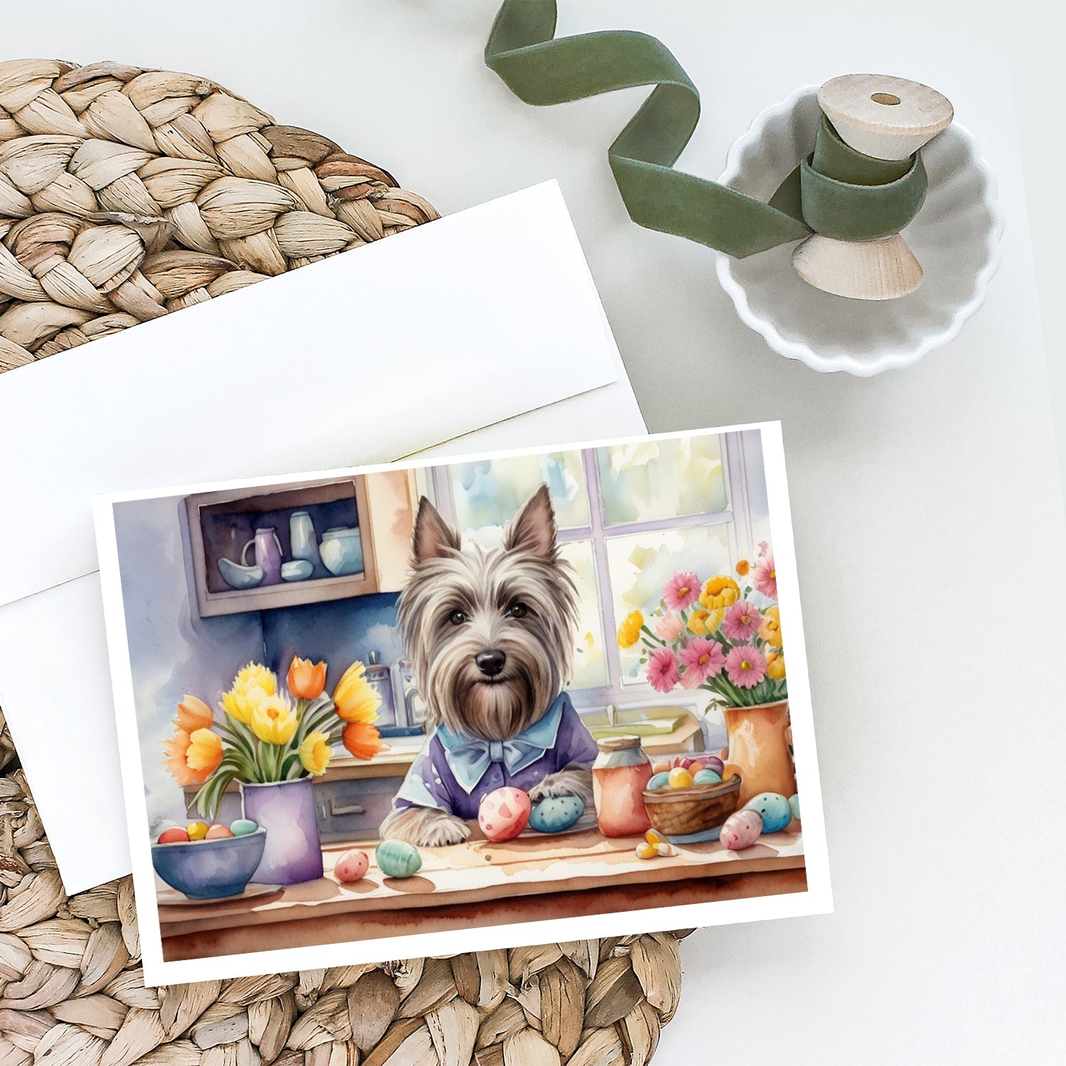 Decorate your space with our Easter Skye Terrier artwork on a . Celebrate special moments with Caroline's Treasures Printed Greeting Card Pack. This pack includes eight beautifully folded 5x7 cards, accompanied by eight matching white envelopes. With blank interiors, these cards provide ample space for your personalized messages and heartfelt holiday greetings. Each card features captivating full-color artwork, meticulously printed in our facility on high-quality 80 lb cover stock or 216 GSM. The super smooth finish of the white cards enhances the visual impact of the artwork, creating a truly stunning presentation. Designed by our talented in-house artists or licensed artists, the artwork on these cards showcases their creativity and attention to detail. From vibrant illustrations to captivating designs, each card tells its own unique story. Whether it's for birthdays, anniversaries, holidays, or any special occasion, Caroline's Treasures Greeting Card Pack is the perfect way to convey your heartfelt sentiments. Share joy, love, and warm wishes with these exquisite cards and make every moment unforgettable.