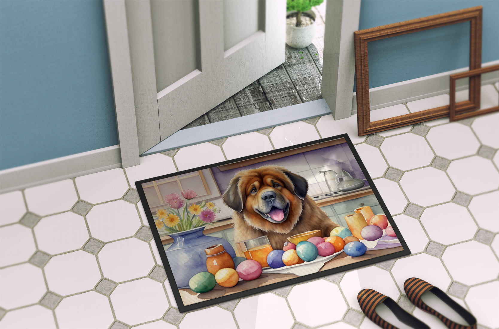 Decorate your space with our Easter Tibetan Mastiff artwork on a Doormat. Welcome your guests in style with our Artwork Door Mat, designed to withstand almost any weather condition. This mat, measuring approximately 18 by 27 inches, is held together by durable black binding tape. Its top layer, composed of polyester felt, is dyed with the eye-catching image you see on the mat. A few layers below provide the mat with stability, while its rubber bottom is stamped to help prevent slipping and ensures safety. Our mat works wonderfully as both an indoor or outdoor door mat. For cleaning, simply hose it off with water or use a power washer - no need for any cleaner that produces suds. Avoid scrubbing with a brush, instead, opt for the vacuum on floor setting. Designed manufactured and printed in the USA, this mat is a perfect addition to your porch, outdoor kitchen, entryway, or any indoor space. Its unique design makes it a charming decorative rug that greets your guests and adds a stylish touch to your home decor.