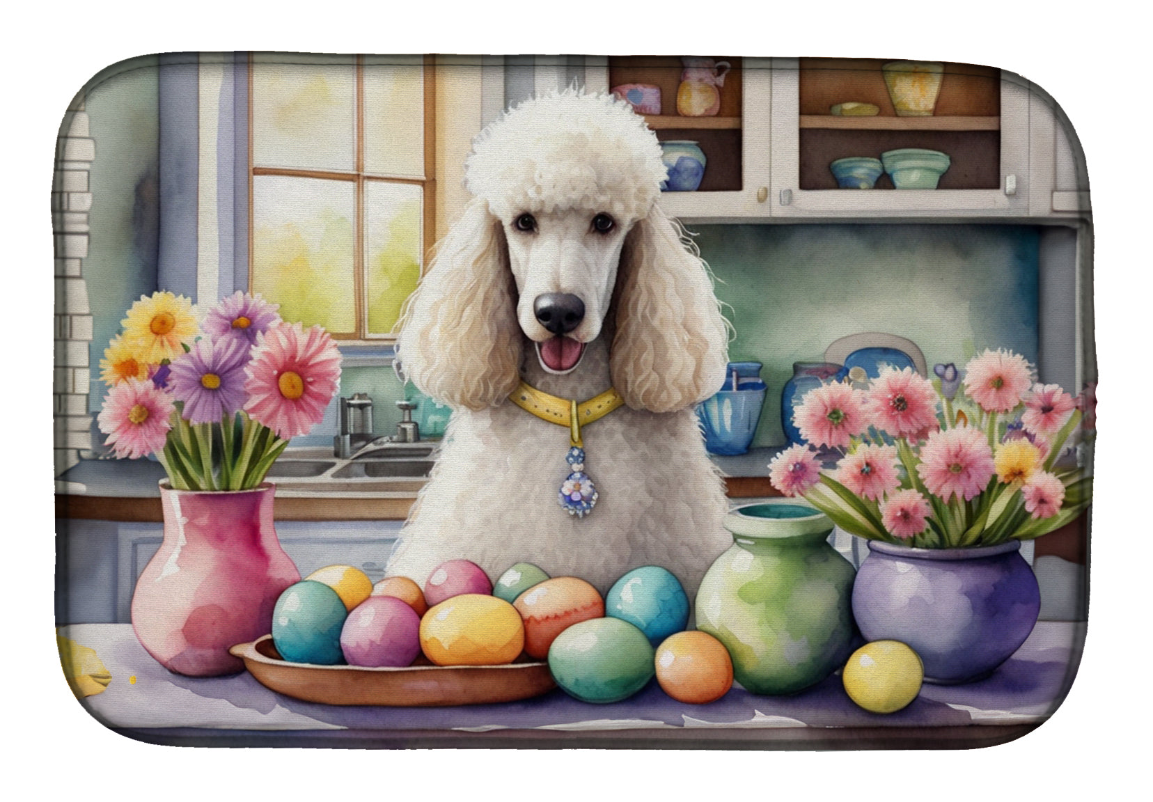 Dish Drying Mat featuring breed specific Poodle artwork. Celebrate Easter with this Easter Dish Drying Mat. Say goodbye to messy countertops and soggy dish towels with our innovative dish drying mat. Our high-quality dish drying pad is designed to keep your countertops dry while offering a stylish and efficient solution. Whether you're air drying dishes, glasses, stemware, silverware, pots, pans, bottles, or even fruits and vegetables, our dish mat is the perfect choice. The 14 inches x 22 inches size fits most counters and dish drying racks, and the non-slip design ensures stability. Made with water-absorbent polyester and a polyurethane foam insert, our dish drying mat is not only functional but also durable. It's machine washable and printed in the USA for long-lasting use. The beautiful artwork adds flair to your kitchen decor, making it a perfect housewarming gift or present for any occasion. Upgrade your kitchen experience with our absorbent and versatile dish drying mat.