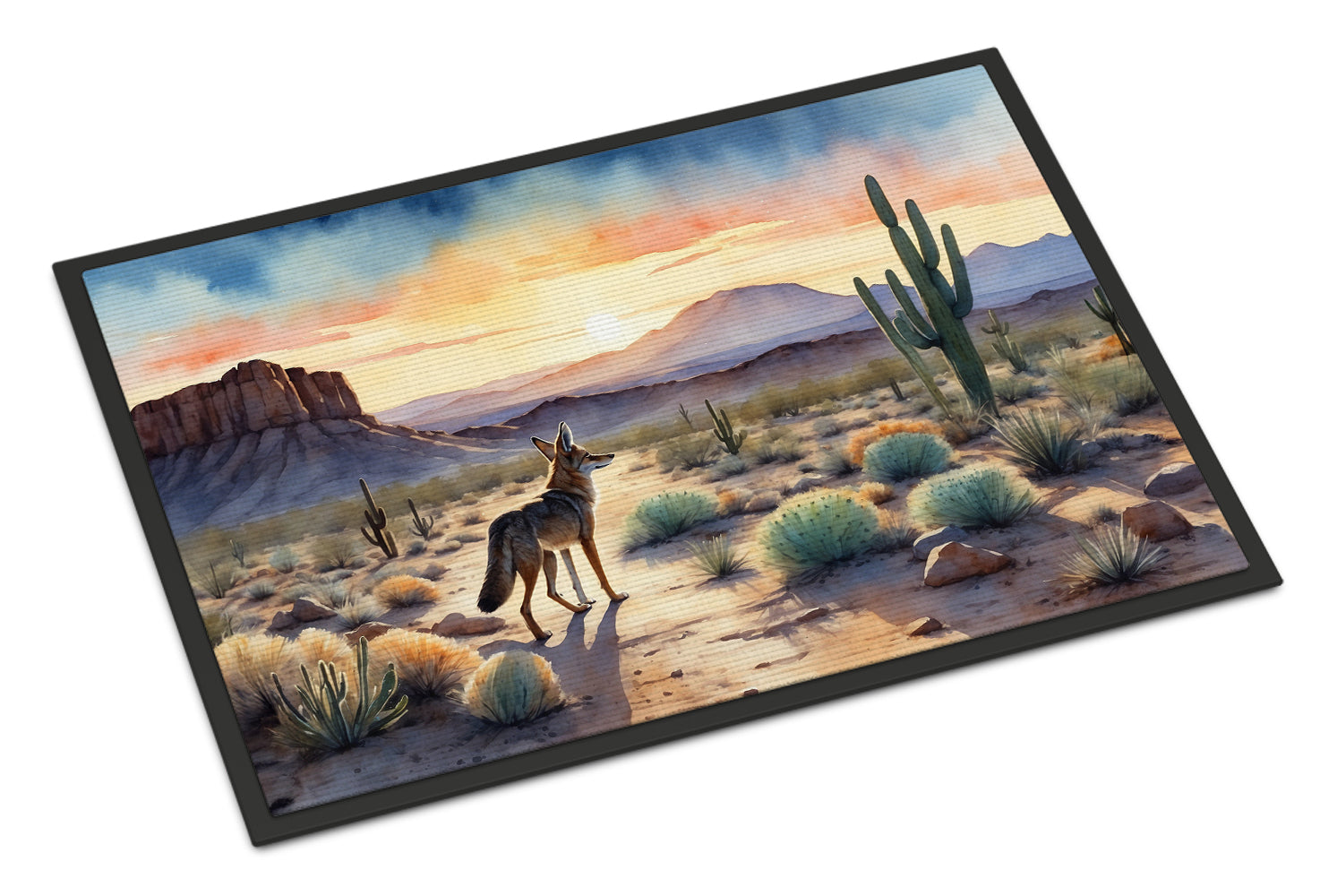 Doormat featuring breed specific Coyote artwork. Welcome your guests in style with our Artwork Door Mat, designed to withstand almost any weather condition. This mat, measuring approximately 24 by 36 inches, is held together by durable black binding tape. Its top layer, composed of polyester felt, is dyed with the eye-catching image you see on the mat. A few layers below provide the mat with stability, while its rubber bottom is stamped to help prevent slipping and ensures safety. Our mat works wonderfully as both an indoor or outdoor door mat. For cleaning, simply hose it off with water or use a power washer - no need for any cleaner that produces suds. Avoid scrubbing with a brush, instead, opt for the vacuum on floor setting. Designed manufactured and printed in the USA, this mat is a perfect addition to your porch, outdoor kitchen, entryway, or any indoor space. Its unique design makes it a charming decorative rug that greets your guests and adds a stylish touch to your home decor.