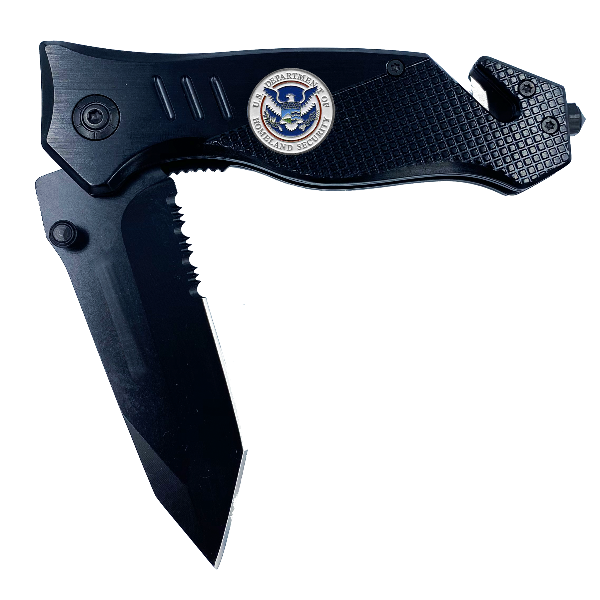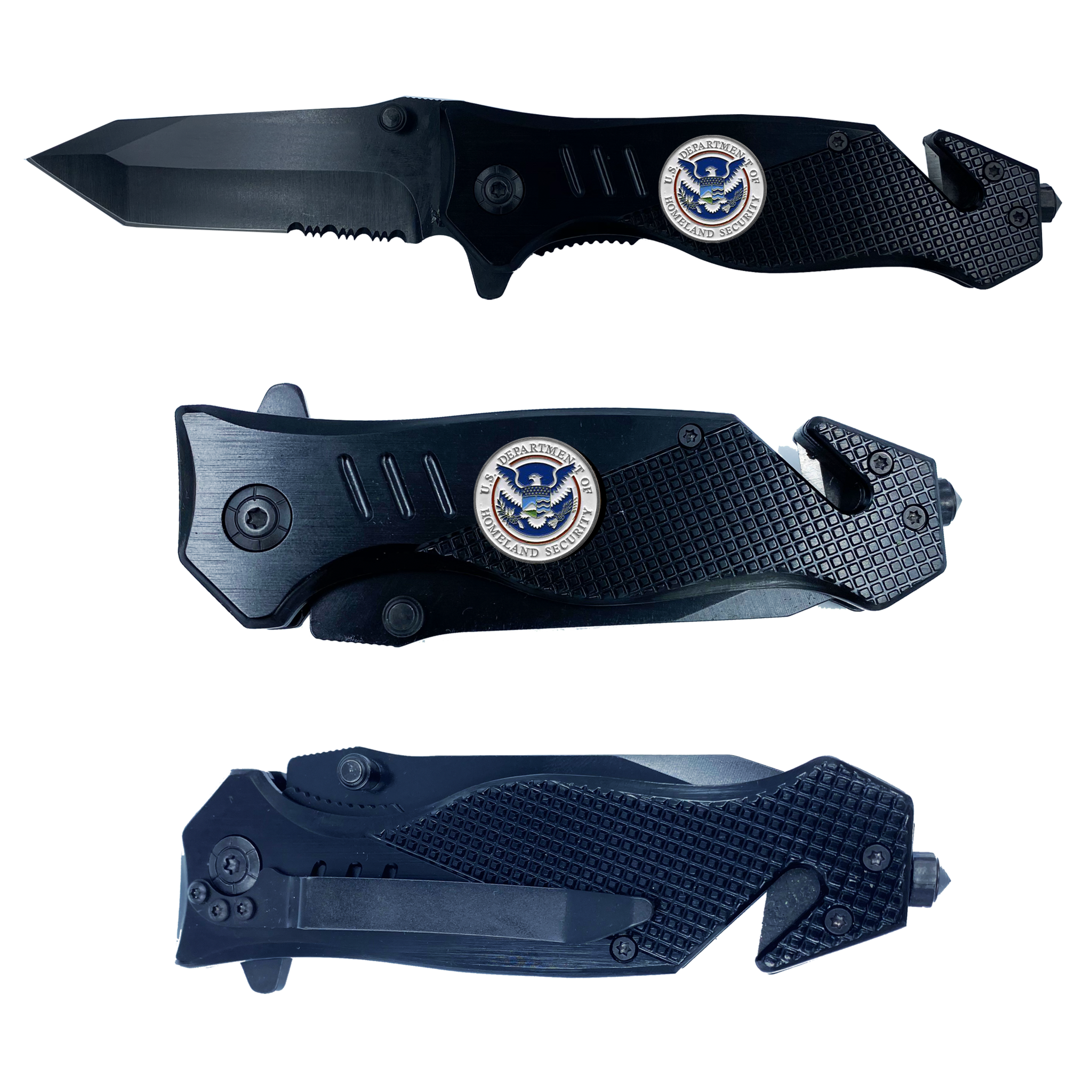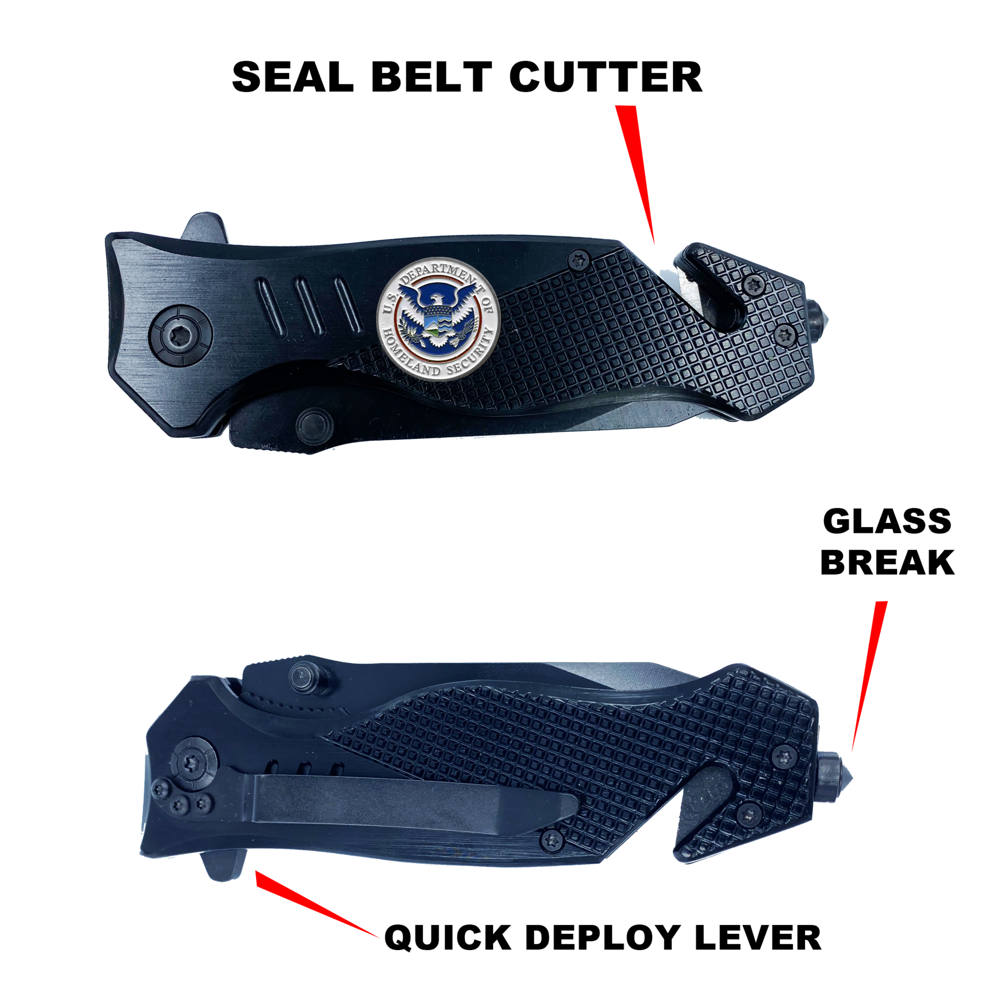 The knife features a steel blade with an aluminum handle and a pocket clip. It weighs 5.2 oz. This rescue tool features a built-in seatbelt cutter, stainless steel knife blade, and glass breaking tip. The stainless steel blade is 3.5 inches and 3mm thick. It has a 4.75 inch closed length and fits in EMT holsters. It has a built-in safety lock and hand grip for emergency situations and rescue. ULMG-1190