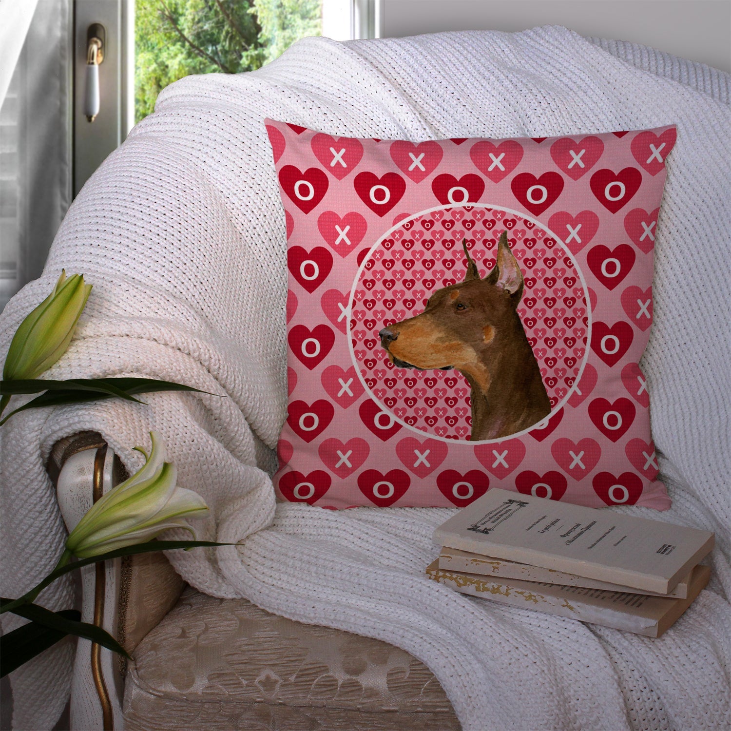 Decorate your space with our Valentine's Day Doberman Pinscher artwork on a Pillow. Add a touch of vibrancy and comfort to your outdoor seating with Caroline's Treasures Fabric Decorative Pillow. Measuring approximately 14 inches by 14 inches, this outdoor pillow is crafted to elevate the appeal of your patio furniture, infusing it with vivid color and artistic flair. The pillow includes a 100% Polyester Fabric sham filled with a quality pillow form to provide superior comfort. Innovatively made from our brand new material, specifically woven for its water resistance, this pillow is designed for durability. The soft canvas fabric offers versatility in use, fit for your indoor couch or your outdoor patio, porch, or veranda. The fabric is dyed with colorfast dyes built for resilience against weather conditions, ensuring the pillow retains its beauty over time. Constructed by sewing three fabric pieces to create a sham, the polyester insert is then nestled inside to form the pillow, resulting in an overstuffed pillow that maintains its shape. Both the sham and the pillow insert are proudly made in the United States. As the pillows are handcrafted, there may be minor variations in size, further enhancing their unique charm. Experience comfort in style with Caroline's Treasures Fabric Decorative Pillow.