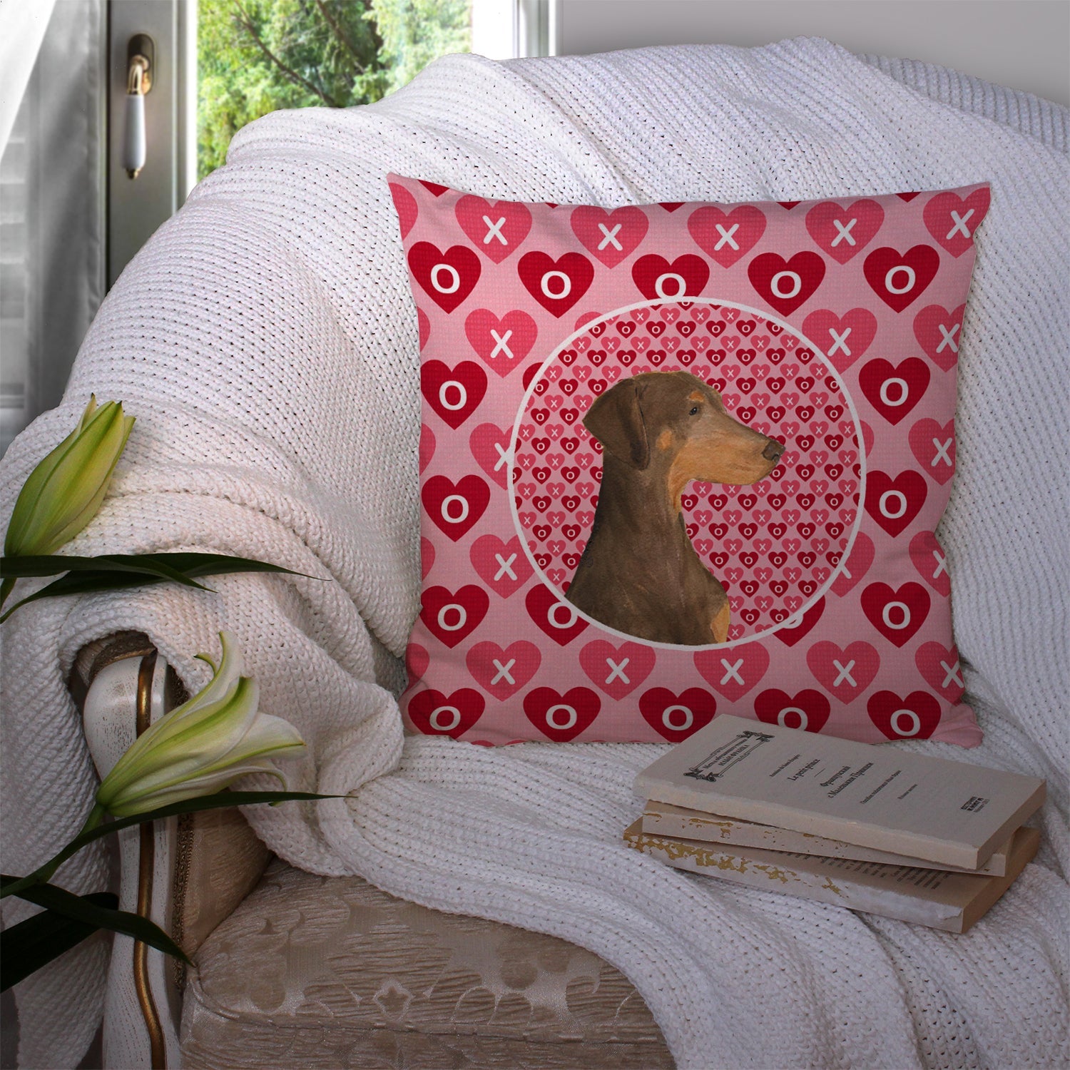 Decorate your space with our Valentine's Day Doberman Pinscher artwork on a Pillow. Add a touch of vibrancy and comfort to your outdoor seating with Caroline's Treasures Fabric Decorative Pillow. Measuring approximately 14 inches by 14 inches, this outdoor pillow is crafted to elevate the appeal of your patio furniture, infusing it with vivid color and artistic flair. The pillow includes a 100% Polyester Fabric sham filled with a quality pillow form to provide superior comfort. Innovatively made from our brand new material, specifically woven for its water resistance, this pillow is designed for durability. The soft canvas fabric offers versatility in use, fit for your indoor couch or your outdoor patio, porch, or veranda. The fabric is dyed with colorfast dyes built for resilience against weather conditions, ensuring the pillow retains its beauty over time. Constructed by sewing three fabric pieces to create a sham, the polyester insert is then nestled inside to form the pillow, resulting in an overstuffed pillow that maintains its shape. Both the sham and the pillow insert are proudly made in the United States. As the pillows are handcrafted, there may be minor variations in size, further enhancing their unique charm. Experience comfort in style with Caroline's Treasures Fabric Decorative Pillow.