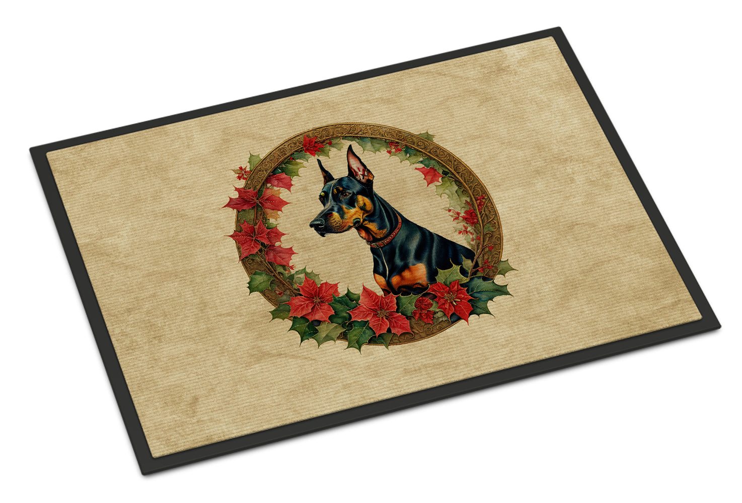 Decorate your space with our Christmas Doberman Pinscher artwork on a Doormat. Bring a bit of Winter into your home with a Winter Doormat. Welcome your guests in style with our Artwork Door Mat, designed to withstand almost any weather condition. This mat, measuring approximately 24 by 36 inches, is held together by durable black binding tape. Its top layer, composed of polyester felt, is dyed with the eye-catching image you see on the mat. A few layers below provide the mat with stability, while its rubber bottom is stamped to help prevent slipping and ensures safety. Our mat works wonderfully as both an indoor or outdoor door mat. For cleaning, simply hose it off with water or use a power washer - no need for any cleaner that produces suds. Avoid scrubbing with a brush, instead, opt for the vacuum on floor setting. Designed manufactured and printed in the USA, this mat is a perfect addition to your porch, outdoor kitchen, entryway, or any indoor space. Its unique design makes it a charming decorative rug that greets your guests and adds a stylish touch to your home decor.