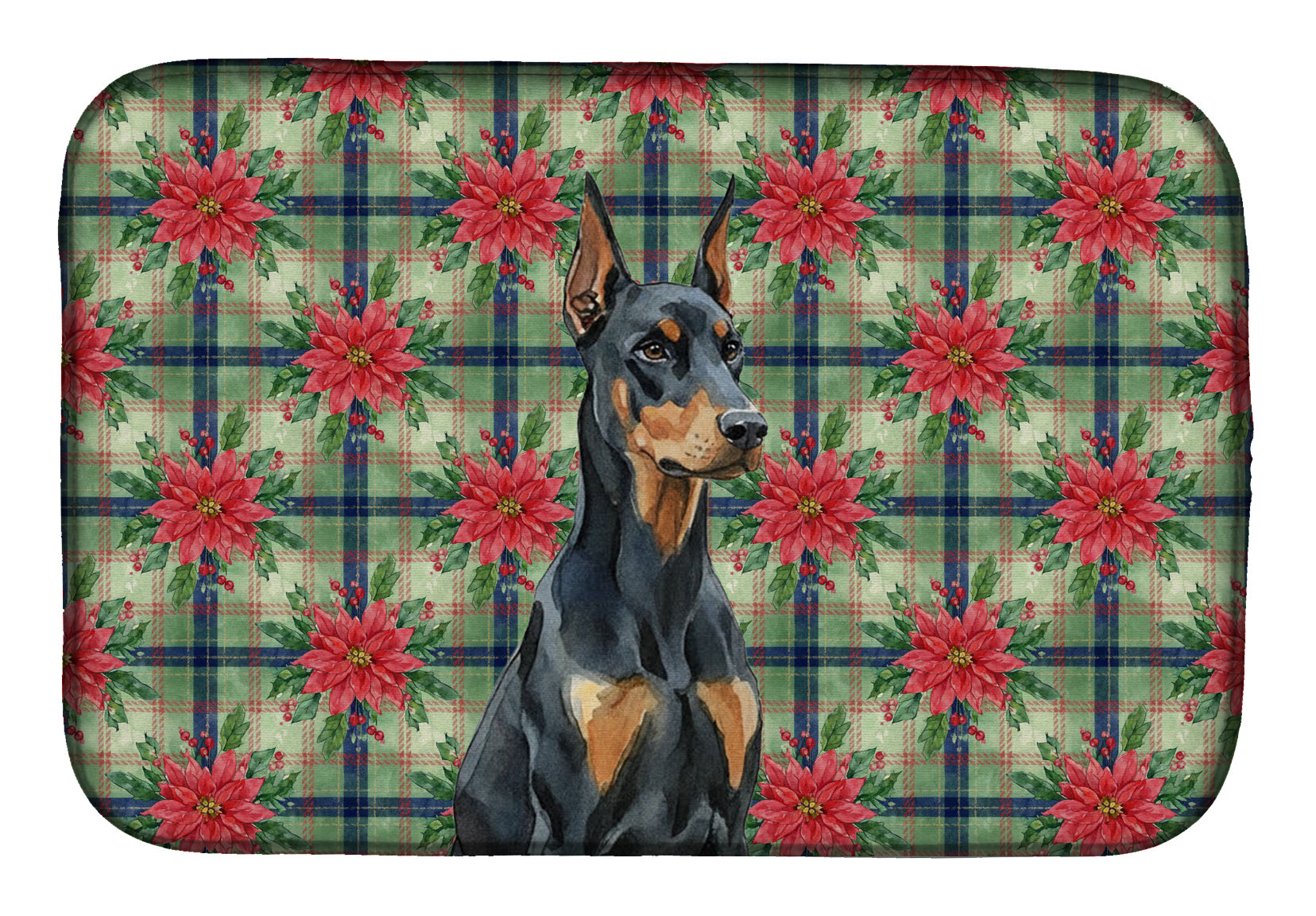 Dish Drying Mat featuring breed specific Doberman Pinscher artwork. Celebrate Christmas with this Christmas Dish Drying Mat. Say goodbye to messy countertops and soggy dish towels with our innovative dish drying mat. Our high-quality dish drying pad is designed to keep your countertops dry while offering a stylish and efficient solution. Whether you're air drying dishes, glasses, stemware, silverware, pots, pans, bottles, or even fruits and vegetables, our dish mat is the perfect choice. The 14 inches x 22 inches size fits most counters and dish drying racks, and the non-slip design ensures stability. Made with water-absorbent polyester and a polyurethane foam insert, our dish drying mat is not only functional but also durable. It's machine washable and printed in the USA for long-lasting use. The beautiful artwork adds flair to your kitchen decor, making it a perfect housewarming gift or present for any occasion. Upgrade your kitchen experience with our absorbent and versatile dish drying mat.