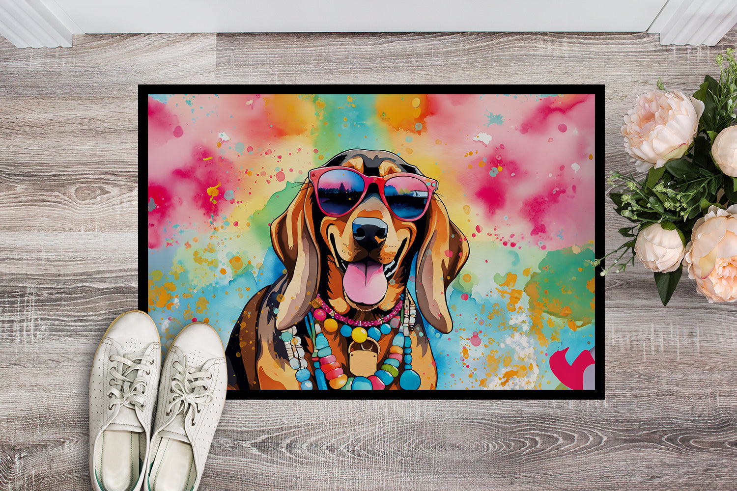 Decorate your space with our Doberman Pinscher artwork on a Doormat. Bring a bit of Summer into your home with a Summer Doormat. Welcome your guests in style with our Artwork Door Mat, designed to withstand almost any weather condition. This mat, measuring approximately 24 by 36 inches, is held together by durable black binding tape. Its top layer, composed of polyester felt, is dyed with the eye-catching image you see on the mat. A few layers below provide the mat with stability, while its rubber bottom is stamped to help prevent slipping and ensures safety. Our mat works wonderfully as both an indoor or outdoor door mat. For cleaning, simply hose it off with water or use a power washer - no need for any cleaner that produces suds. Avoid scrubbing with a brush, instead, opt for the vacuum on floor setting. Designed manufactured and printed in the USA, this mat is a perfect addition to your porch, outdoor kitchen, entryway, or any indoor space. Its unique design makes it a charming decorative rug that greets your guests and adds a stylish touch to your home decor.