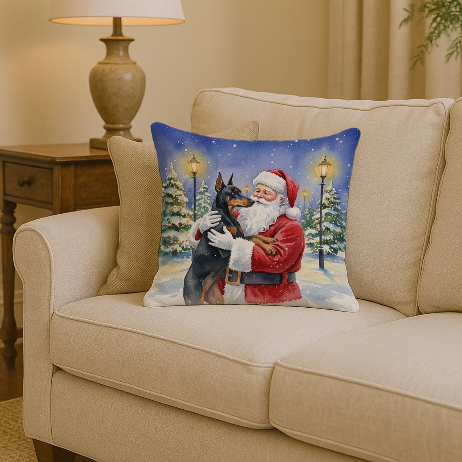 Throw Pillow featuring breed specific Doberman Pinscher artwork. Celebrate Christmas with this Christmas Pillow. Add a touch of vibrancy and comfort to your outdoor seating with Caroline's Treasures Fabric Decorative Pillow. Measuring approximately 14 inches by 14 inches, this outdoor pillow is crafted to elevate the appeal of your patio furniture, infusing it with vivid color and artistic flair. The pillow includes a 100% Polyester Fabric sham filled with a quality pillow form to provide superior comfort. Innovatively made from our brand new material, specifically woven for its water resistance, this pillow is designed for durability. The soft canvas fabric offers versatility in use, fit for your indoor couch or your outdoor patio, porch, or veranda. The fabric is dyed with colorfast dyes built for resilience against weather conditions, ensuring the pillow retains its beauty over time. Constructed by sewing three fabric pieces to create a sham, the polyester insert is then nestled inside to form the pillow, resulting in an overstuffed pillow that maintains its shape. Both the sham and the pillow insert are proudly made in the United States. As the pillows are handcrafted, there may be minor variations in size, further enhancing their unique charm. Experience comfort in style with Caroline's Treasures Fabric Decorative Pillow.