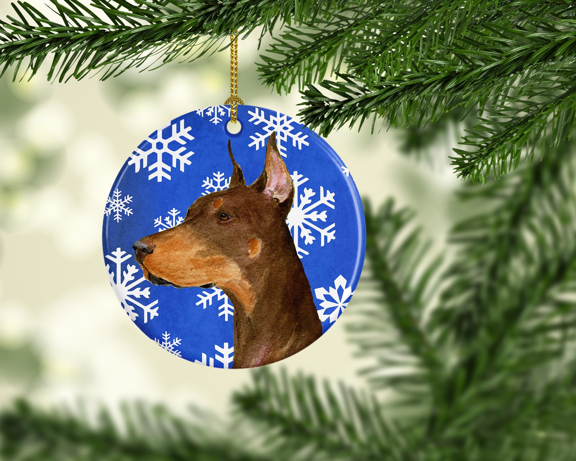 Decorate your space with our Christmas Doberman Pinscher artwork on a Ornament. Bring a bit of Winter into your home with a Winter Ornament. Add a touch of personalized charm to your Christmas tree this holiday season with our Ceramic Ornament. Measuring 2.8125 inches in diameter, this round porcelain ornament beautifully reflects your festive lights, enhancing your holiday decor. The gloss surface sets off the vibrant, full-color artwork contributed by one of our talented artists, bringing a pop of color and joy to your tree. This Ceramic Ornament doesn't stop at being merely decorative. The white back is designed for personalization. Write a heartfelt message, mark a special year, or inscribe a date with a paint pen or a permanent marker to create a treasured memento. Please ensure you allow any personalization to dry thoroughly before handling to maintain the pristine finish. Included with the ornament is a delicate gold cord for easy hanging. Made in the USA, this Ceramic Ornament makes an exceptional gift for a pet sitter, teacher, family member, or anyone you wish to share a little Christmas magic with. With its blend of style, charm, and personal touch, it's a meaningful addition to any Christmas tree.