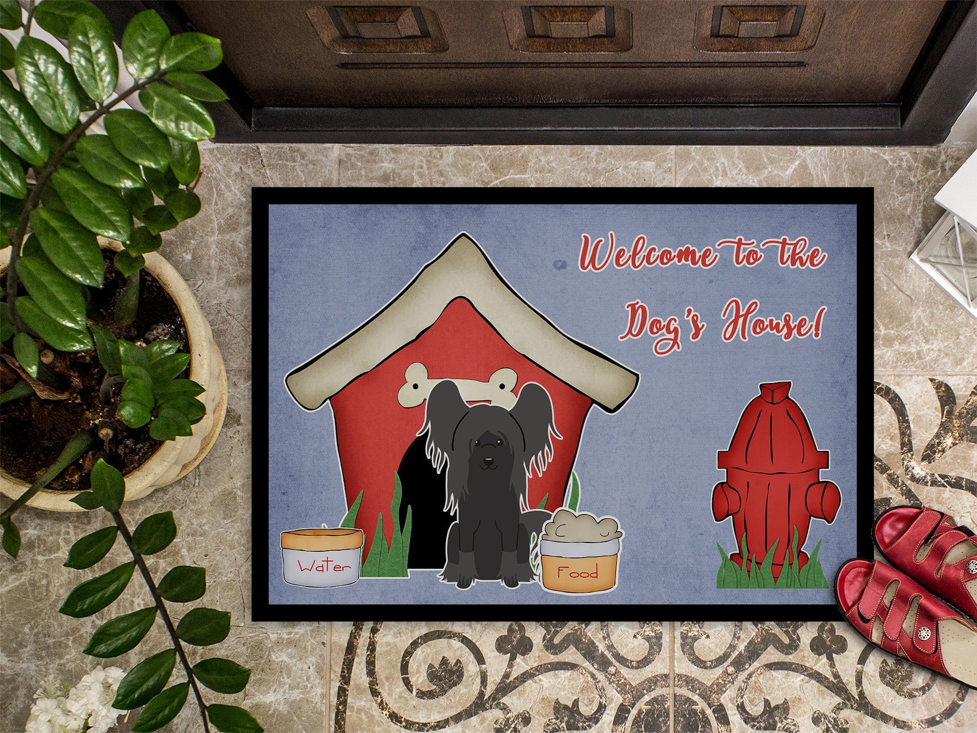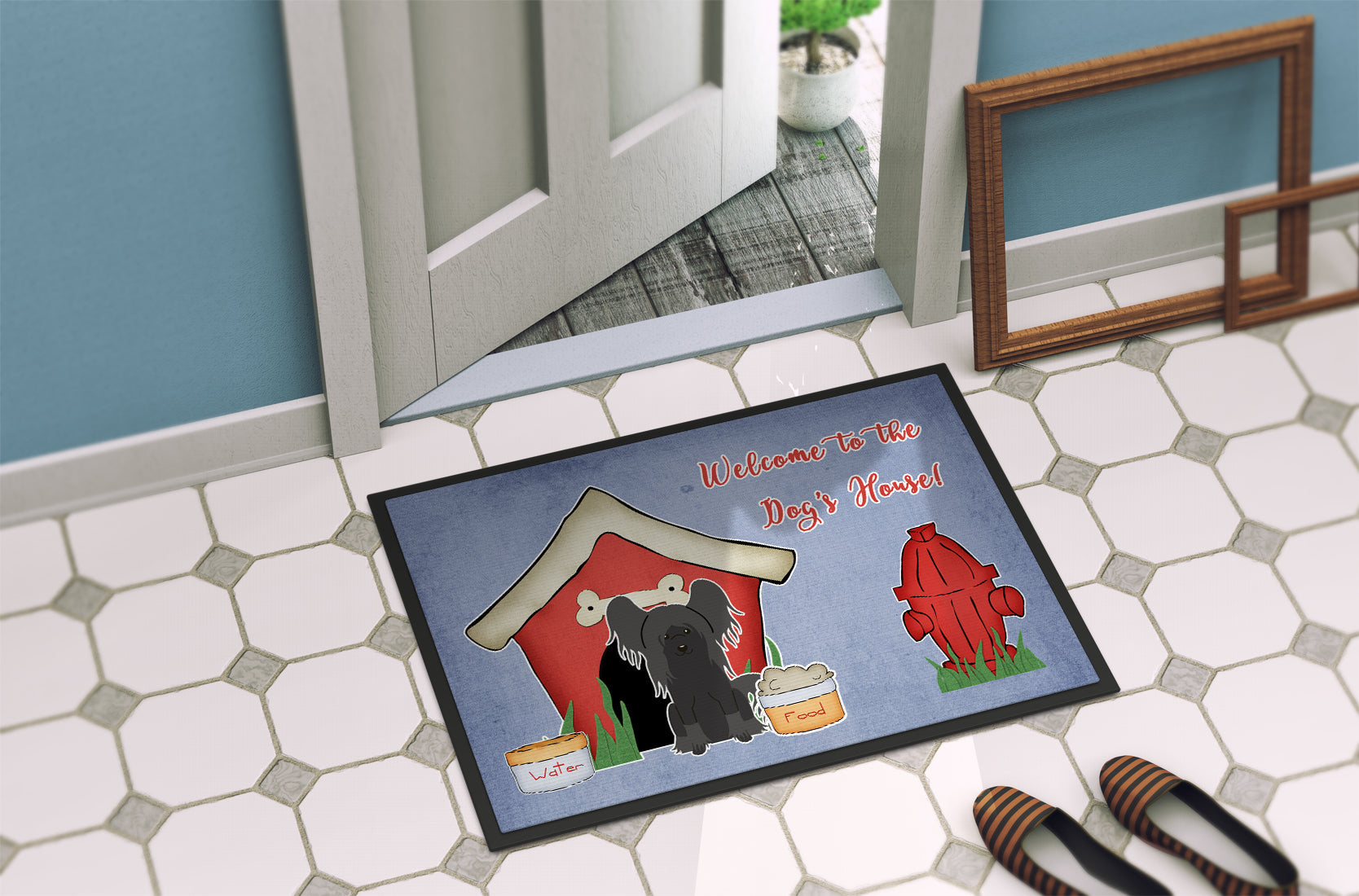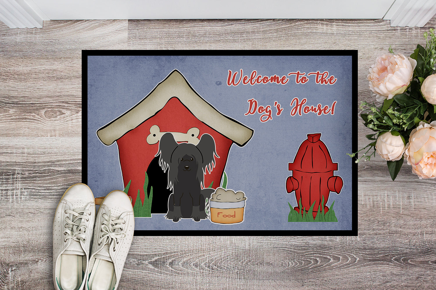 Decorate your space with our Chinese Crested artwork on a Doormat. Welcome your guests in style with our Artwork Door Mat, designed to withstand almost any weather condition. This mat, measuring approximately 24 by 36 inches, is held together by durable black binding tape. Its top layer, composed of polyester felt, is dyed with the eye-catching image you see on the mat. A few layers below provide the mat with stability, while its rubber bottom is stamped to help prevent slipping and ensures safety. Our mat works wonderfully as both an indoor or outdoor door mat. For cleaning, simply hose it off with water or use a power washer - no need for any cleaner that produces suds. Avoid scrubbing with a brush, instead, opt for the vacuum on floor setting. Designed manufactured and printed in the USA, this mat is a perfect addition to your porch, outdoor kitchen, entryway, or any indoor space. Its unique design makes it a charming decorative rug that greets your guests and adds a stylish touch to your home decor.