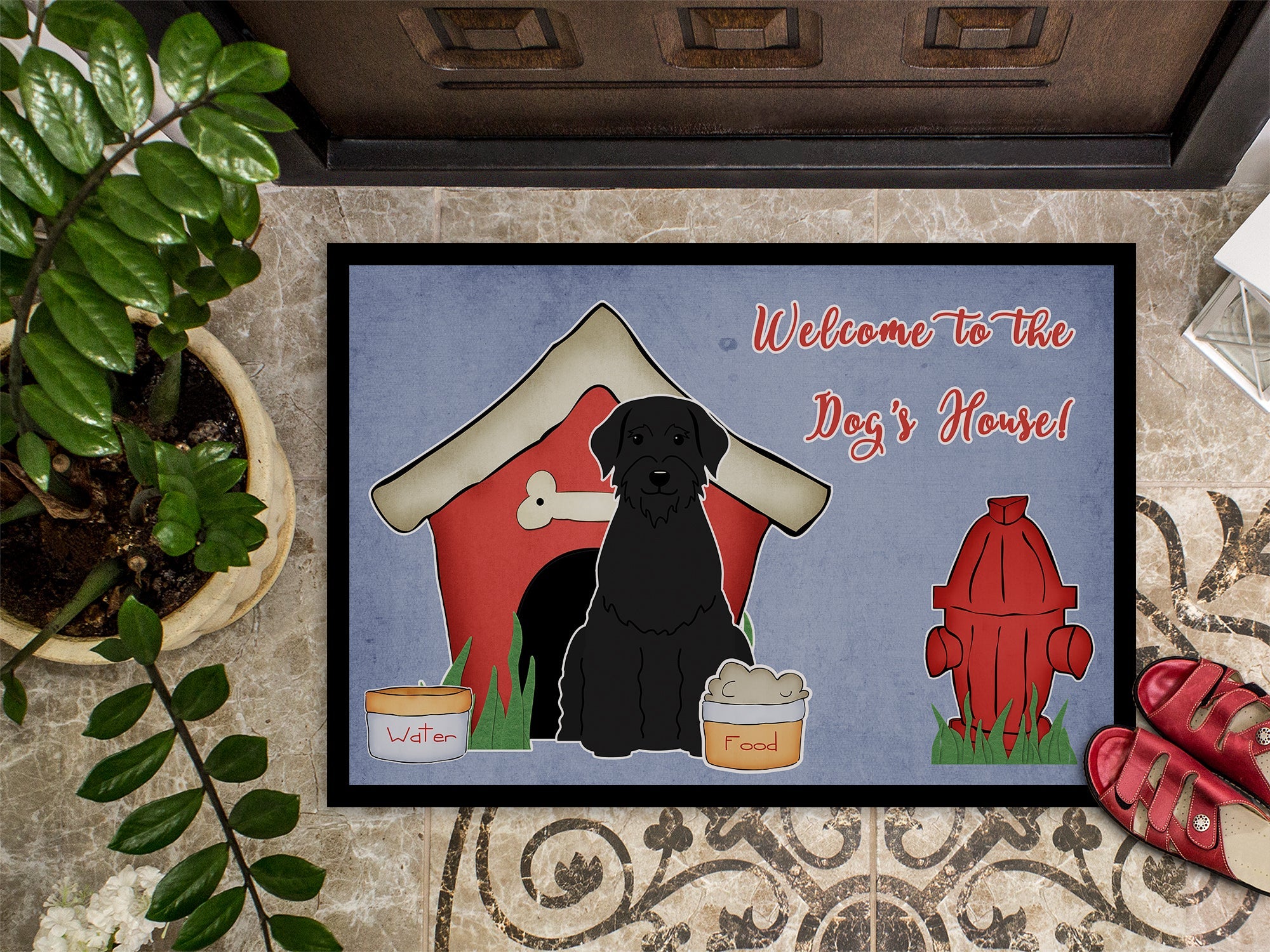 Decorate your space with our Schnauzer artwork on a Doormat. Welcome your guests in style with our Artwork Door Mat, designed to withstand almost any weather condition. This mat, measuring approximately 24 by 36 inches, is held together by durable black binding tape. Its top layer, composed of polyester felt, is dyed with the eye-catching image you see on the mat. A few layers below provide the mat with stability, while its rubber bottom is stamped to help prevent slipping and ensures safety. Our mat works wonderfully as both an indoor or outdoor door mat. For cleaning, simply hose it off with water or use a power washer - no need for any cleaner that produces suds. Avoid scrubbing with a brush, instead, opt for the vacuum on floor setting. Designed manufactured and printed in the USA, this mat is a perfect addition to your porch, outdoor kitchen, entryway, or any indoor space. Its unique design makes it a charming decorative rug that greets your guests and adds a stylish touch to your home decor.