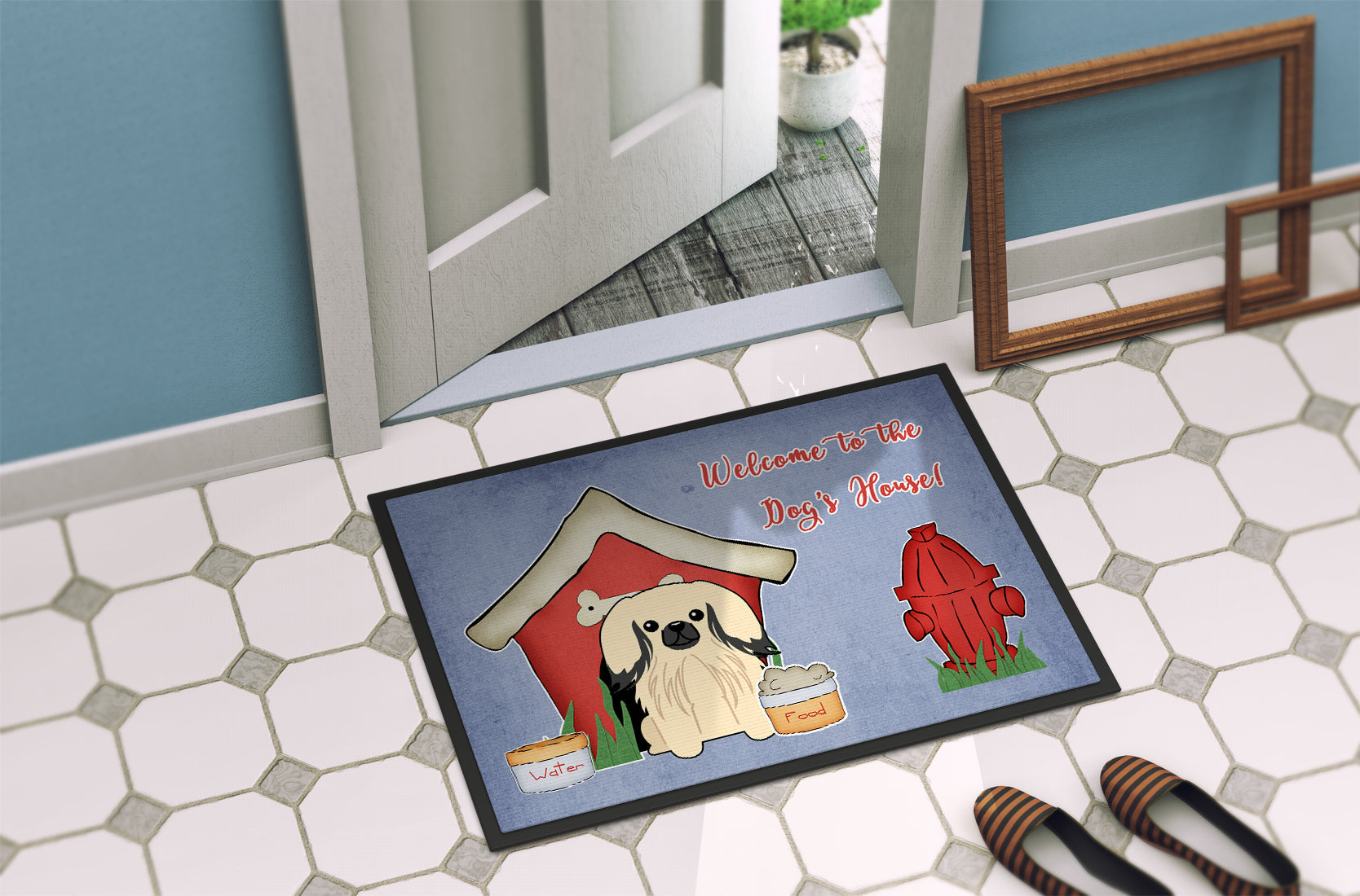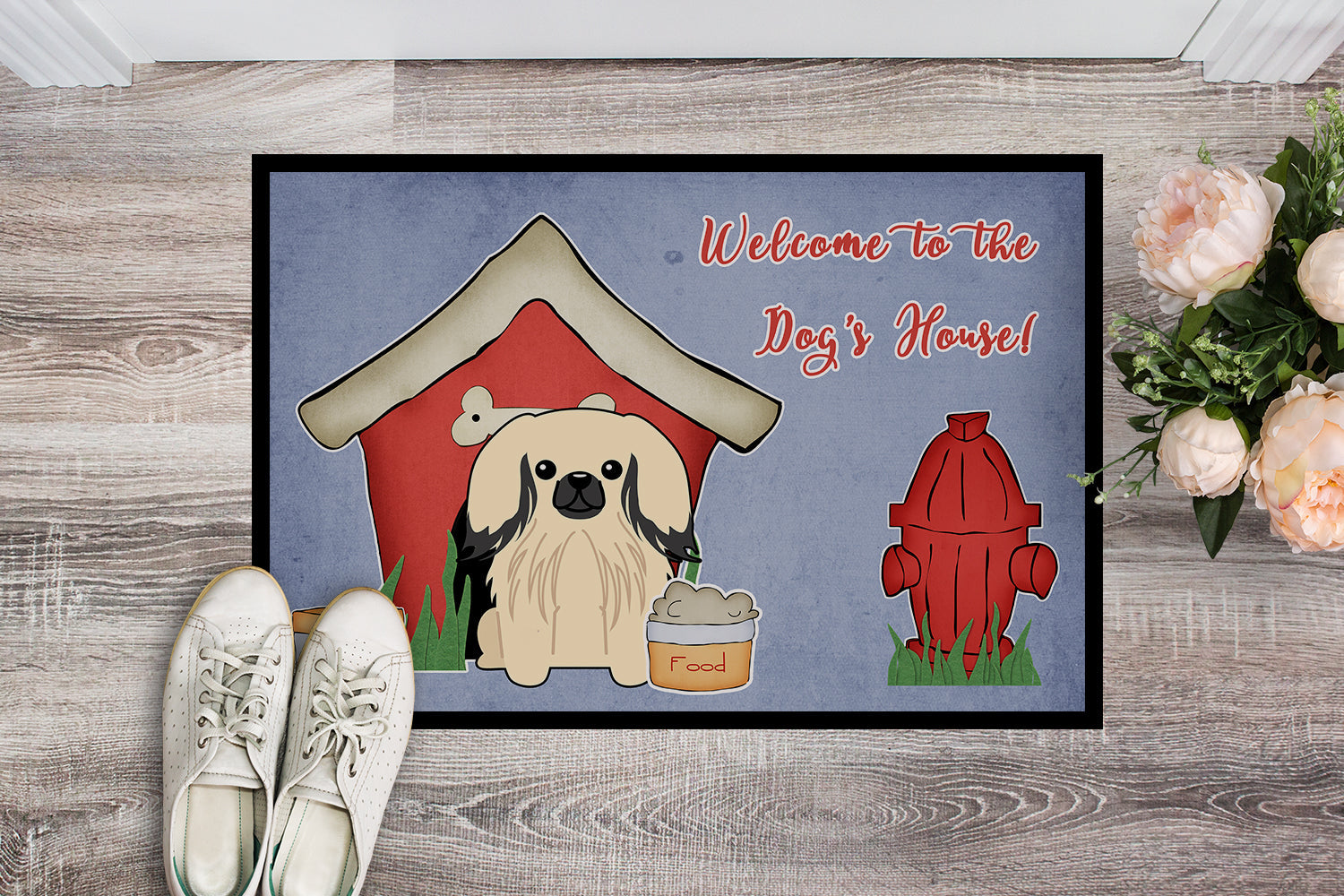 Decorate your space with our Pekingese artwork on a Doormat. Welcome your guests in style with our Artwork Door Mat, designed to withstand almost any weather condition. This mat, measuring approximately 24 by 36 inches, is held together by durable black binding tape. Its top layer, composed of polyester felt, is dyed with the eye-catching image you see on the mat. A few layers below provide the mat with stability, while its rubber bottom is stamped to help prevent slipping and ensures safety. Our mat works wonderfully as both an indoor or outdoor door mat. For cleaning, simply hose it off with water or use a power washer - no need for any cleaner that produces suds. Avoid scrubbing with a brush, instead, opt for the vacuum on floor setting. Designed manufactured and printed in the USA, this mat is a perfect addition to your porch, outdoor kitchen, entryway, or any indoor space. Its unique design makes it a charming decorative rug that greets your guests and adds a stylish touch to your home decor.
