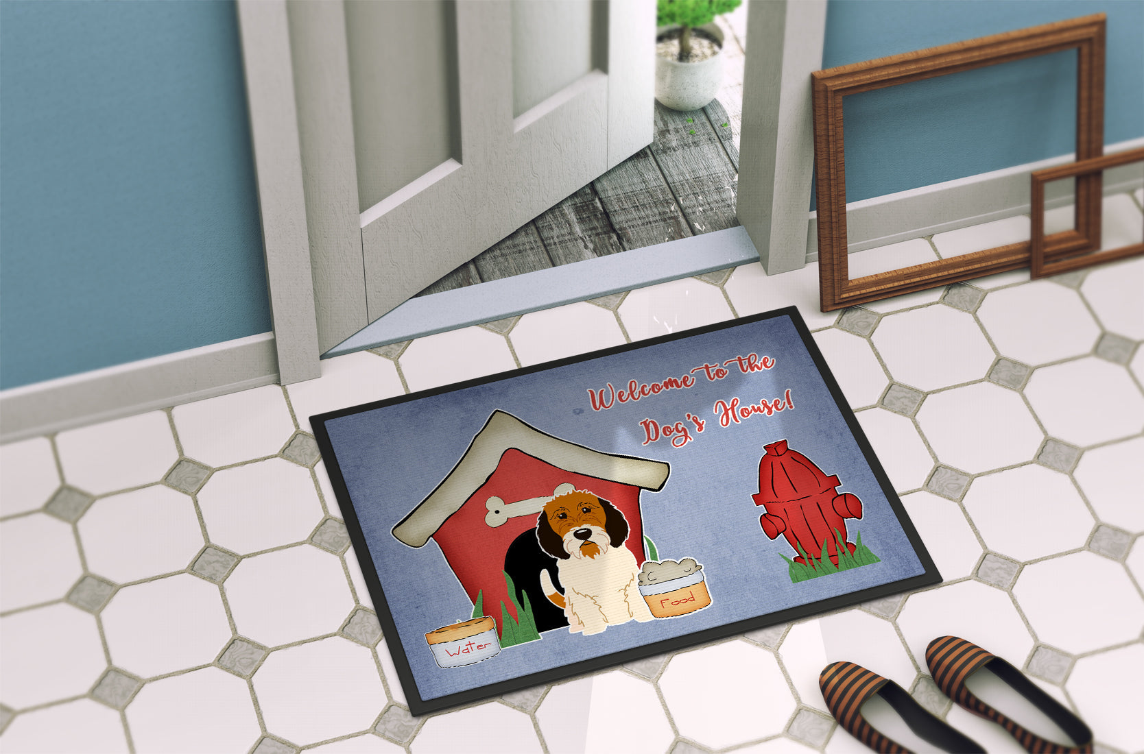 Decorate your space with our Petit Basset Griffon Vend�en artwork on a Doormat. Welcome your guests in style with our Artwork Door Mat, designed to withstand almost any weather condition. This mat, measuring approximately 24 by 36 inches, is held together by durable black binding tape. Its top layer, composed of polyester felt, is dyed with the eye-catching image you see on the mat. A few layers below provide the mat with stability, while its rubber bottom is stamped to help prevent slipping and ensures safety. Our mat works wonderfully as both an indoor or outdoor door mat. For cleaning, simply hose it off with water or use a power washer - no need for any cleaner that produces suds. Avoid scrubbing with a brush, instead, opt for the vacuum on floor setting. Designed manufactured and printed in the USA, this mat is a perfect addition to your porch, outdoor kitchen, entryway, or any indoor space. Its unique design makes it a charming decorative rug that greets your guests and adds a stylish touch to your home decor.