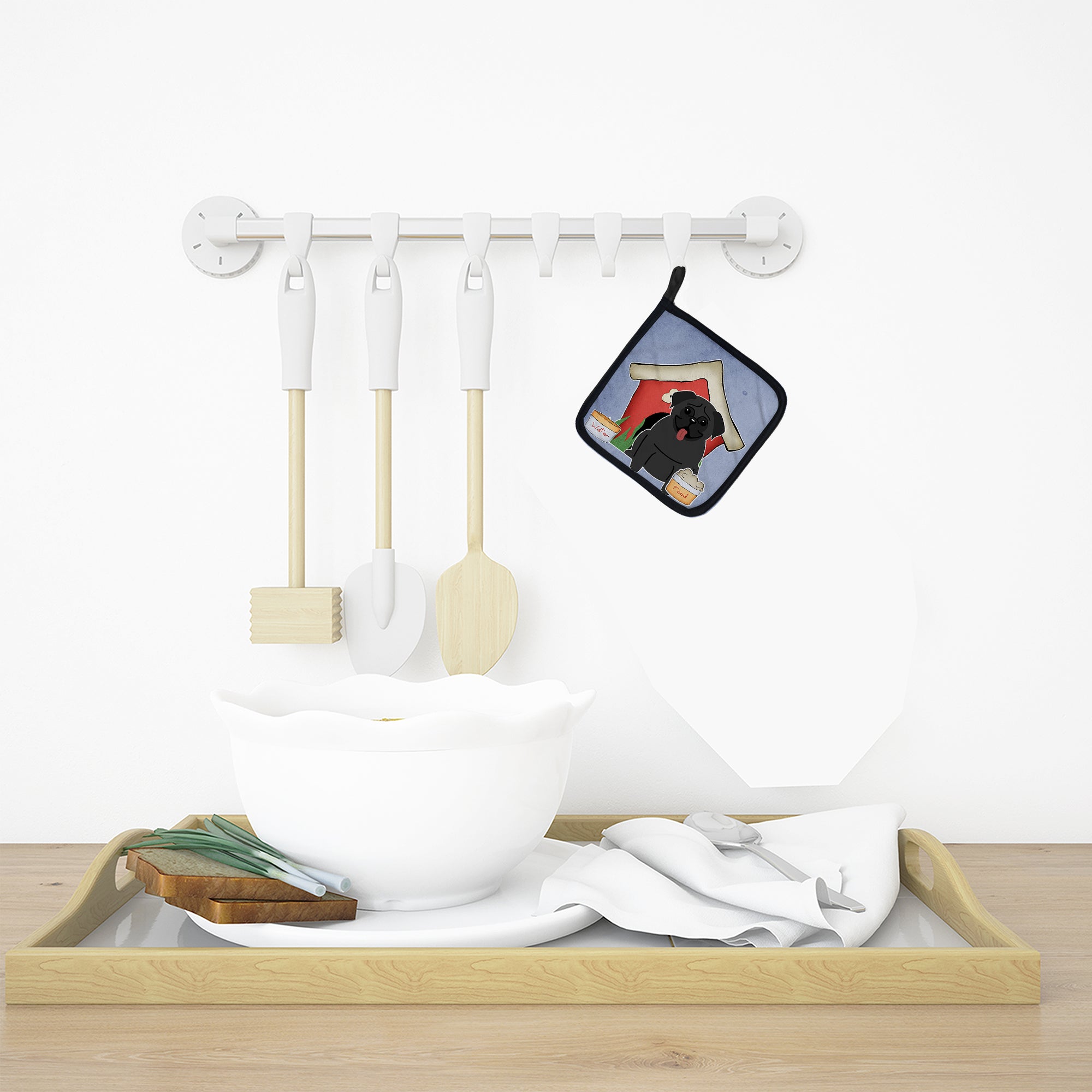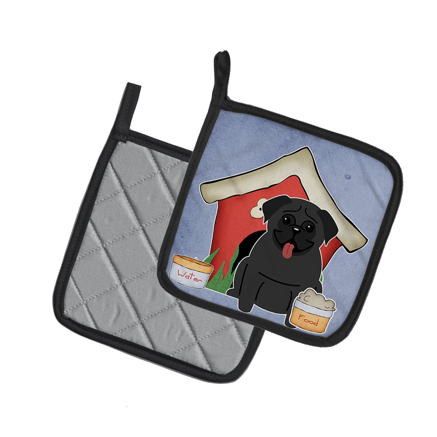 Decorate your space with our Pug artwork on a Pair of Pot Holders. A Pair of Pot Holders to match your kitchen decor. Made in the USA these are thick and functional. Full color artwork decorates the front polyester fabric of the hot pad and accented by a black trim. Use these at as a trivet for your Thanksgiving or Christmas tablescape. Filled with insulated fabric and quilted for durability. These colorful pot holders will make a great gift for your favorite home cook or executive chef. Each pot holder measures approximately 7 1/2 inches by 7 1/2 inches. A hanging tab is included.