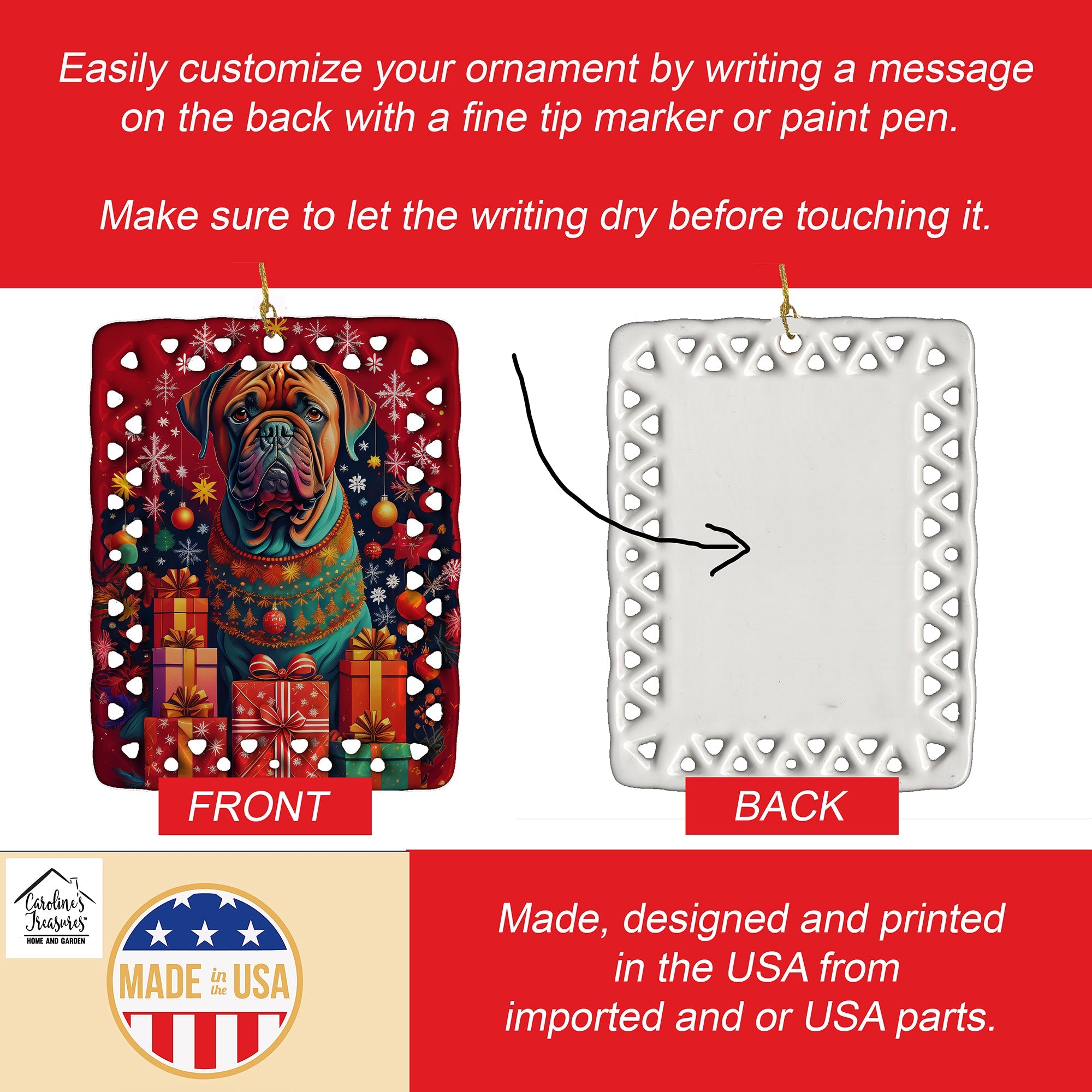 Porcelain Ornament featuring breed specific Dogue de Bordeaux artwork. Celebrate Christmas with this Christmas Ornament. Add a unique, personal touch to your holiday decor with our Rectangular Lattice Porcelain Ornament. Perfect for creating cherished memories, this high-quality ornament shines under festive lights, reflecting warmth and joy throughout your Christmas tree. Crafted with a glossy finish, it showcases vibrant, full-color artwork contributed by our talented artists, ensuring your tree is adorned with a burst of color and holiday spirit. What sets this Porcelain Ornament apart is its customizable white back. Use a paint pen or permanent marker to write a heartfelt message, commemorate a special year, or mark an unforgettable date, turning this ornament into a keepsake that will be treasured for years to come. For best results, allow any personalization to dry thoroughly before handling. Each ornament comes complete with a delicate gold cord, making it easy to hang and display. Proudly made in the USA, this ornament measures 3.375 x 2.625 inches and is a thoughtful gift for pet sitters, teachers, family members, or anyone who would appreciate a little extra holiday magic. Bring style, charm, and a touch of personal meaning to your Christmas tree with this beautifully designed ornament..