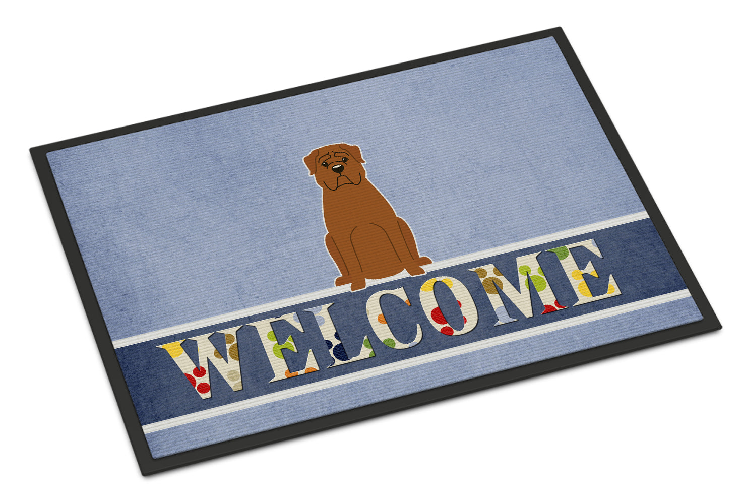 Decorate your space with our Dogue de Bourdeaux artwork on a Doormat. Welcome your guests in style with our Artwork Door Mat, designed to withstand almost any weather condition. This mat, measuring approximately 18 by 27 inches, is held together by durable black binding tape. Its top layer, composed of polyester felt, is dyed with the eye-catching image you see on the mat. A few layers below provide the mat with stability, while its rubber bottom is stamped to help prevent slipping and ensures safety. Our mat works wonderfully as both an indoor or outdoor door mat. For cleaning, simply hose it off with water or use a power washer - no need for any cleaner that produces suds. Avoid scrubbing with a brush, instead, opt for the vacuum on floor setting. Designed manufactured and printed in the USA, this mat is a perfect addition to your porch, outdoor kitchen, entryway, or any indoor space. Its unique design makes it a charming decorative rug that greets your guests and adds a stylish touch to your home decor.