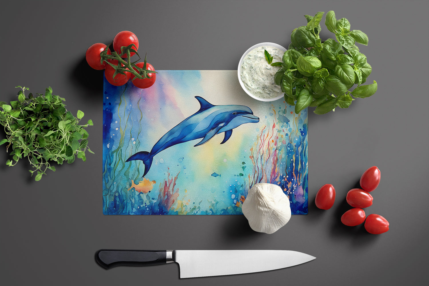 Decorate your space with our Dolphin artwork on a Cutting Board. Introduce your kitchen to the vibrant, large Decorative Glass Cutting Board from Caroline's Treasures. Crafted from resilient tempered glass, this board is not only a utilitarian necessity but also a colorful art piece. With its generous dimensions of 15 inches in height and 12 inches in length, it offers ample space for all your cutting needs. Every piece showcases captivating artwork from distinguished artists, bringing an aesthetic edge to your kitchen. Beyond its attractive design, this cutting board ensures your countertop stays pristine and unscathed, owing to its heat-resistant properties. Engineered with user convenience in mind, it features non-skid feet for stability, and rounded corners for additional safety. Its robust construction renders it virtually unbreakable, guaranteeing longevity. The board comes with protective feet bumpers, maintaining its position during use. This product is recommended to be hand washed only. Proudly printed and assembled in the United States, this cutting board exemplifies superior craftsmanship. With Caroline's Treasures' Decorative Glass Cutting Board, you're investing in a blend of functionality and artistic flair.