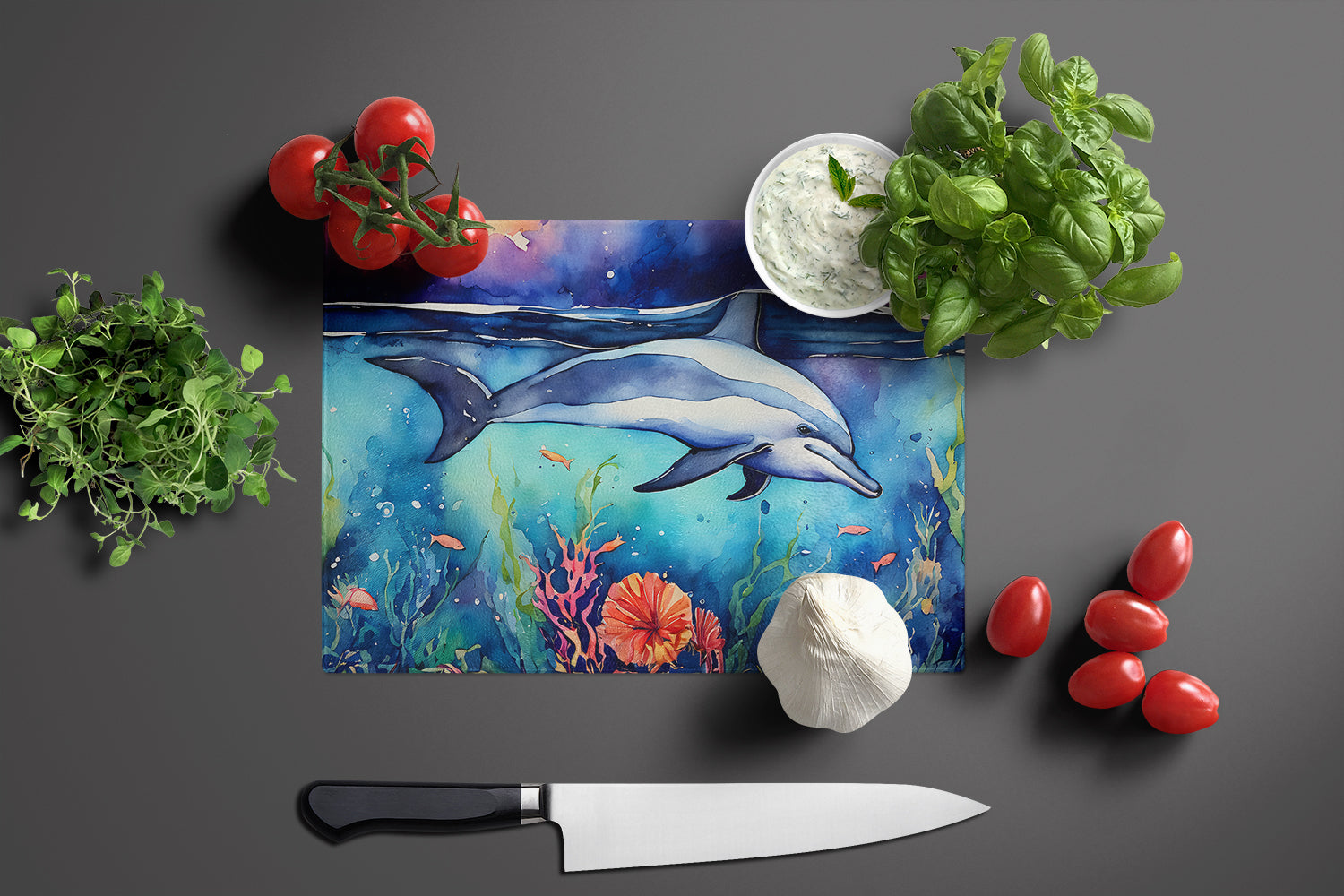 Decorate your space with our Dolphin artwork on a Cutting Board. Introduce your kitchen to the vibrant, large Decorative Glass Cutting Board from Caroline's Treasures. Crafted from resilient tempered glass, this board is not only a utilitarian necessity but also a colorful art piece. With its generous dimensions of 15 inches in height and 12 inches in length, it offers ample space for all your cutting needs. Every piece showcases captivating artwork from distinguished artists, bringing an aesthetic edge to your kitchen. Beyond its attractive design, this cutting board ensures your countertop stays pristine and unscathed, owing to its heat-resistant properties. Engineered with user convenience in mind, it features non-skid feet for stability, and rounded corners for additional safety. Its robust construction renders it virtually unbreakable, guaranteeing longevity. The board comes with protective feet bumpers, maintaining its position during use. This product is recommended to be hand washed only. Proudly printed and assembled in the United States, this cutting board exemplifies superior craftsmanship. With Caroline's Treasures' Decorative Glass Cutting Board, you're investing in a blend of functionality and artistic flair.