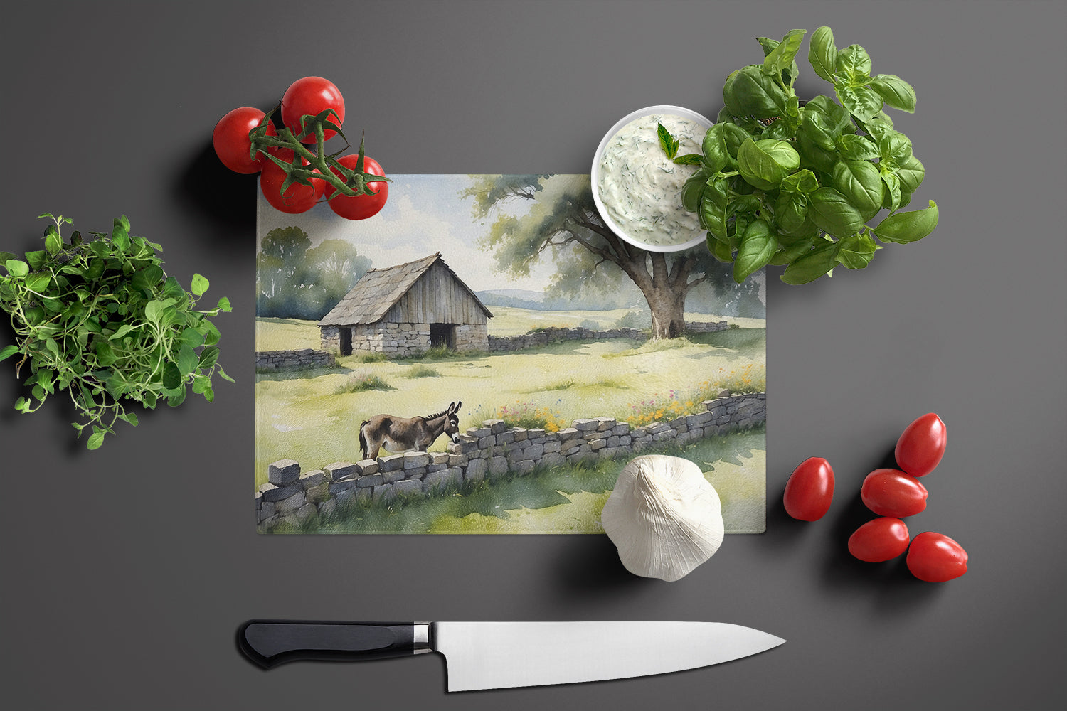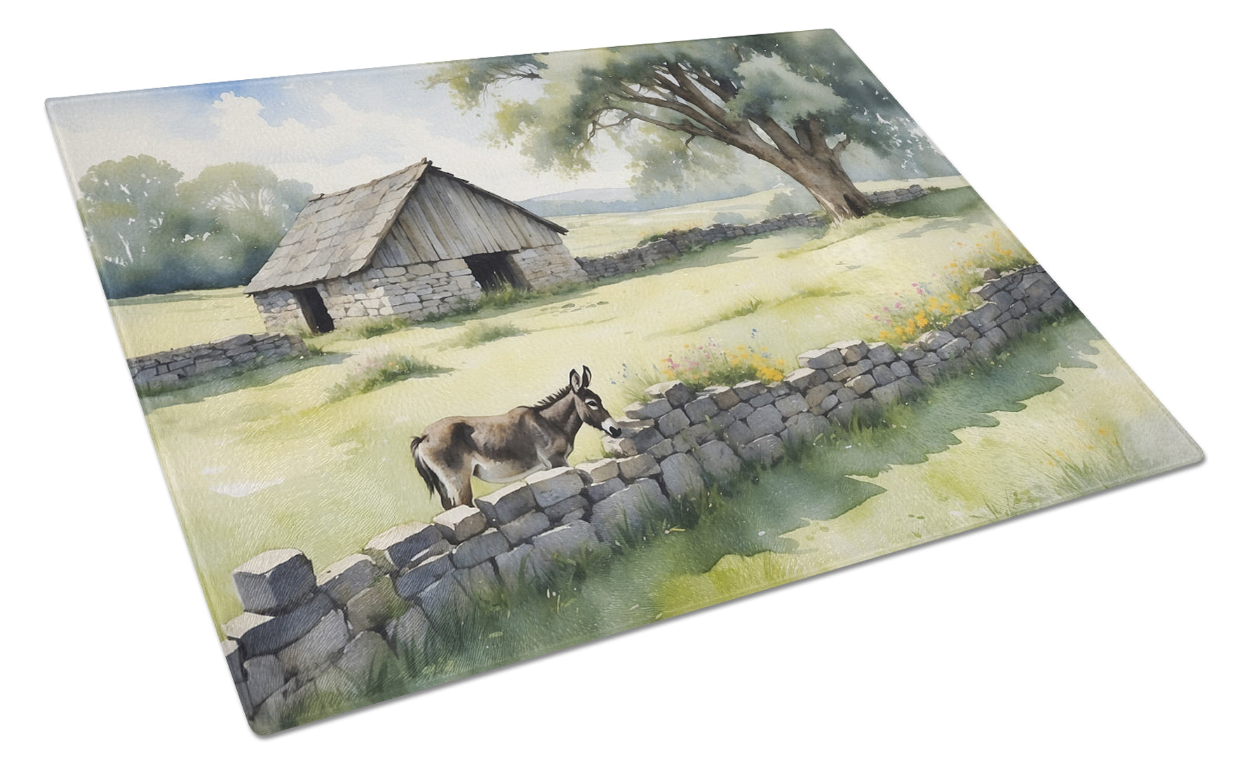 Glass Cutting Board featuring breed specific Donkey artwork. Introduce your kitchen to the vibrant, large Decorative Glass Cutting Board from Caroline's Treasures. Crafted from resilient tempered glass, this board is not only a utilitarian necessity but also a colorful art piece. With its generous dimensions of 15 inches in height and 12 inches in length, it offers ample space for all your cutting needs. Every piece showcases captivating artwork from distinguished artists, bringing an aesthetic edge to your kitchen. Beyond its attractive design, this cutting board ensures your countertop stays pristine and unscathed, owing to its heat-resistant properties. Engineered with user convenience in mind, it features non-skid feet for stability, and rounded corners for additional safety. Its robust construction renders it virtually unbreakable, guaranteeing longevity. The board comes with protective feet bumpers, maintaining its position during use. This product is recommended to be hand washed only. Proudly printed and assembled in the United States, this cutting board exemplifies superior craftsmanship. With Caroline's Treasures' Decorative Glass Cutting Board, you're investing in a blend of functionality and artistic flair.