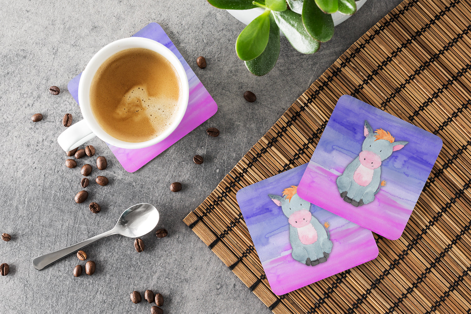 Decorate your space with our Donkey artwork on a Coaster set. Presenting our Set of 4 Foam Coasters, a stylish and practical addition to your table setting. Each square coaster, measuring 3 1/2 inches by 3 1/2 inches, is perfectly sized to accommodate various drinkware, from coffee mugs to tumblers. These coasters stand out with their full-color artwork, permanently dyed onto the material for a vibrant and fade-resistant finish. They're not just functional, they're a fashionable statement, adding a touch of flair to any gathering or event. Our foam coasters serve a dual purpose - they protect your table from water stains and are perfect for both hot and cold drinks. The material used is similar to that of our high-quality mouse pads, ensuring durability and heat resistance. These coasters are easy to maintain - simply wash them in the top of your dishwasher and lay flat to dry. The design won't come off, ensuring they retain their vivid colors for years. Pair them with one of our insulated coolers or huggers for a cohesive, thoughtful gift set. Enhance your beverage experience with our Set of 4 Foam Coasters.