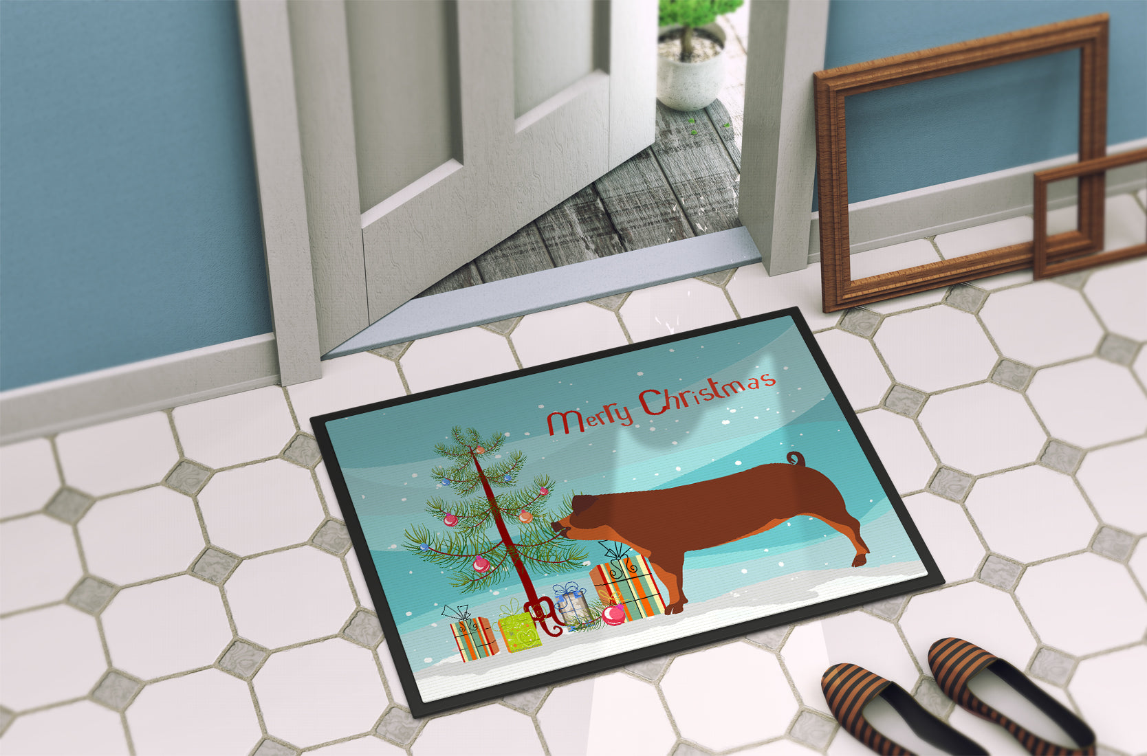 Decorate your space with our Christmas Duroc Pig artwork on a Doormat. Welcome your guests in style with our Artwork Door Mat, designed to withstand almost any weather condition. This mat, measuring approximately 24 by 36 inches, is held together by durable black binding tape. Its top layer, composed of polyester felt, is dyed with the eye-catching image you see on the mat. A few layers below provide the mat with stability, while its rubber bottom is stamped to help prevent slipping and ensures safety. Our mat works wonderfully as both an indoor or outdoor door mat. For cleaning, simply hose it off with water or use a power washer - no need for any cleaner that produces suds. Avoid scrubbing with a brush, instead, opt for the vacuum on floor setting. Designed manufactured and printed in the USA, this mat is a perfect addition to your porch, outdoor kitchen, entryway, or any indoor space. Its unique design makes it a charming decorative rug that greets your guests and adds a stylish touch to your home decor.