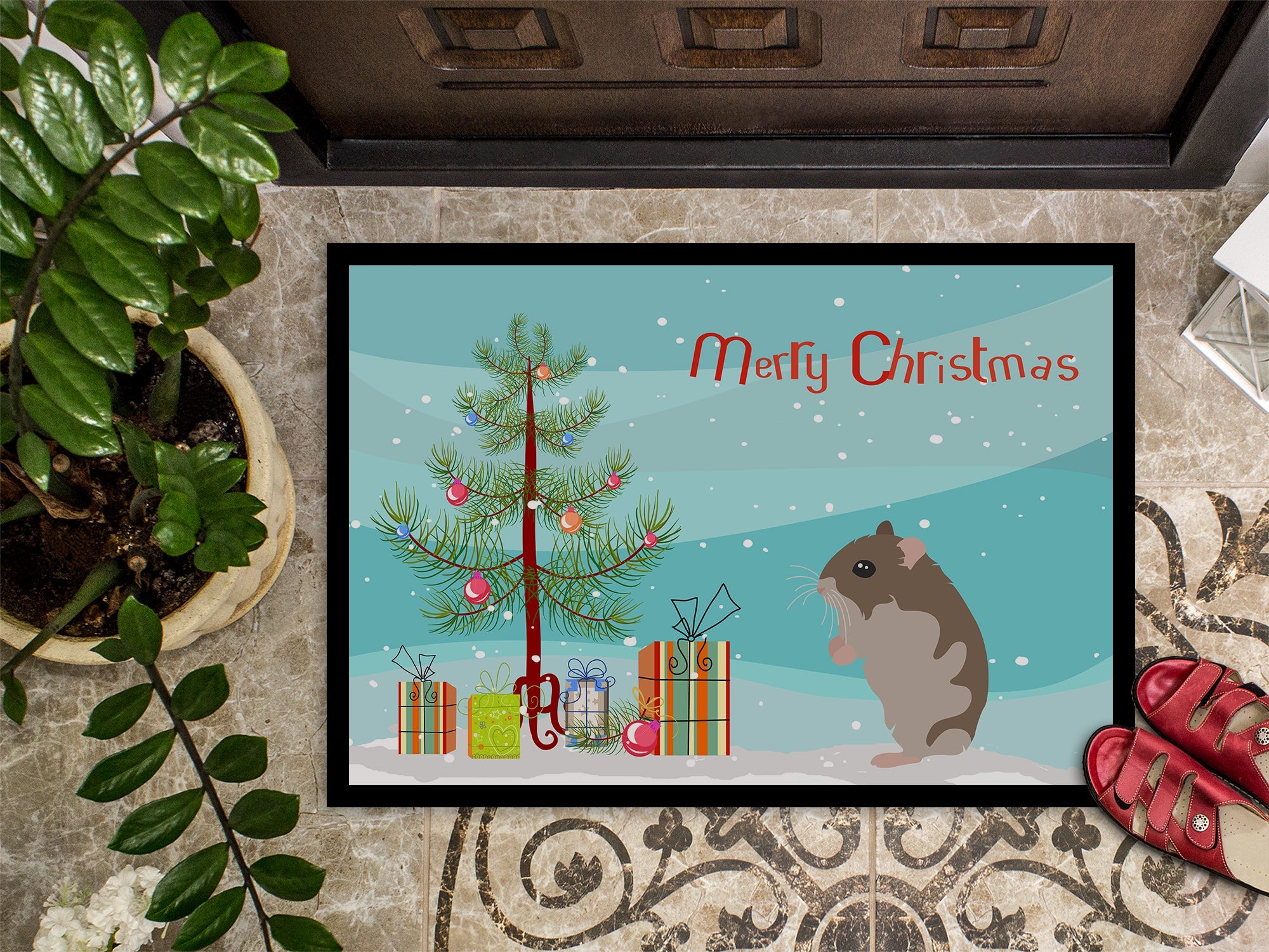 Decorate your space with our Christmas Dwarf Hamster artwork on a Doormat. Welcome your guests in style with our Artwork Door Mat, designed to withstand almost any weather condition. This mat, measuring approximately 24 by 36 inches, is held together by durable black binding tape. Its top layer, composed of polyester felt, is dyed with the eye-catching image you see on the mat. A few layers below provide the mat with stability, while its rubber bottom is stamped to help prevent slipping and ensures safety. Our mat works wonderfully as both an indoor or outdoor door mat. For cleaning, simply hose it off with water or use a power washer - no need for any cleaner that produces suds. Avoid scrubbing with a brush, instead, opt for the vacuum on floor setting. Designed manufactured and printed in the USA, this mat is a perfect addition to your porch, outdoor kitchen, entryway, or any indoor space. Its unique design makes it a charming decorative rug that greets your guests and adds a stylish touch to your home decor.