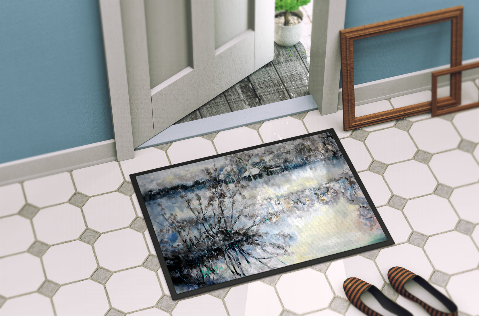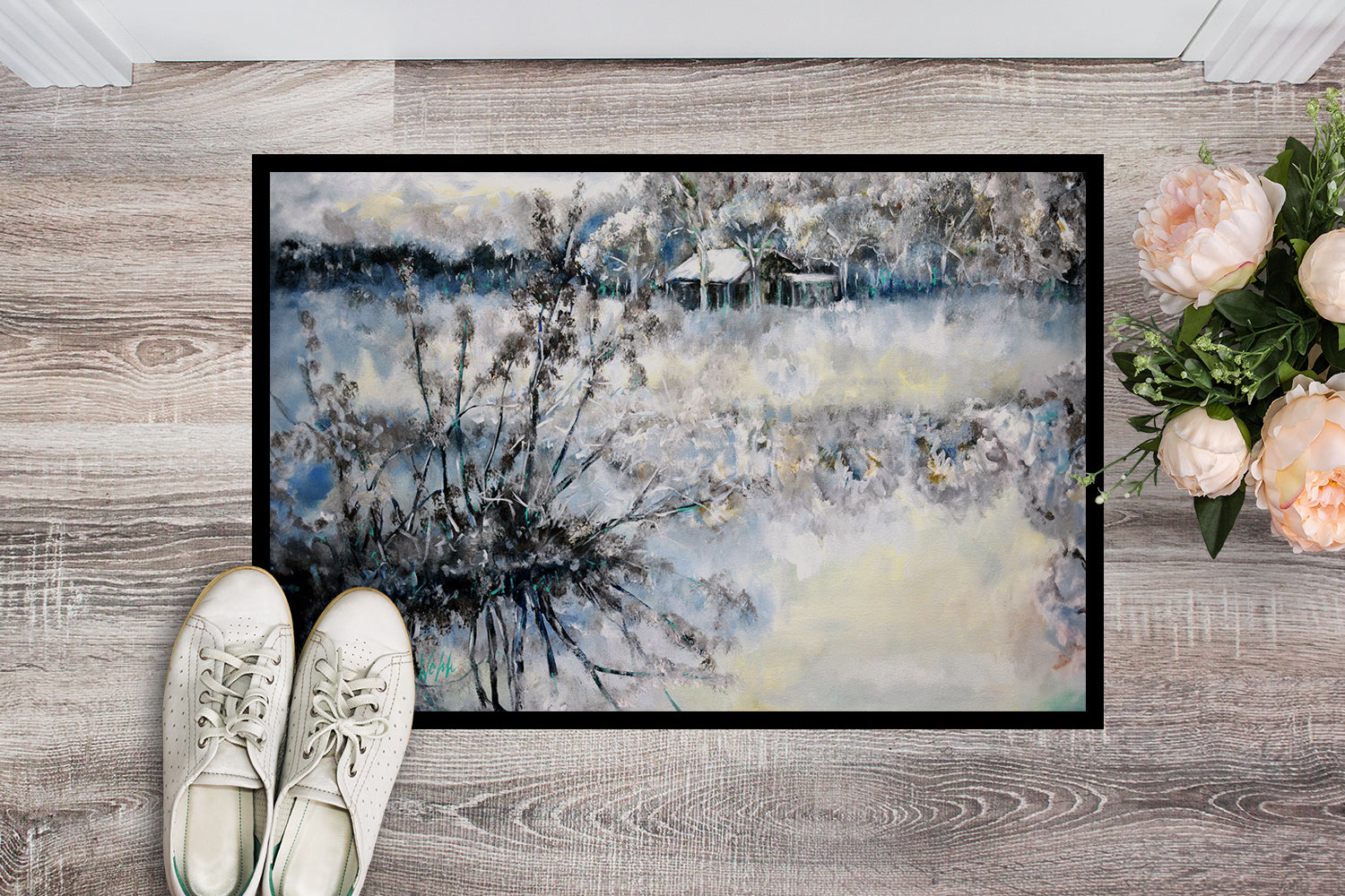 Welcome your guests in style with our Artwork Door Mat, designed to withstand almost any weather condition. This mat, measuring approximately 24 by 36 inches, is held together by durable black binding tape. Its top layer, composed of polyester felt, is dyed with the eye-catching image you see on the mat. A few layers below provide the mat with stability, while its rubber bottom is stamped to help prevent slipping and ensures safety. Our mat works wonderfully as both an indoor or outdoor door mat. For cleaning, simply hose it off with water or use a power washer - no need for any cleaner that produces suds. Avoid scrubbing with a brush, instead, opt for the vacuum on floor setting. Designed manufactured and printed in the USA, this mat is a perfect addition to your porch, outdoor kitchen, entryway, or any indoor space. Its unique design makes it a charming decorative rug that greets your guests and adds a stylish touch to your home decor.