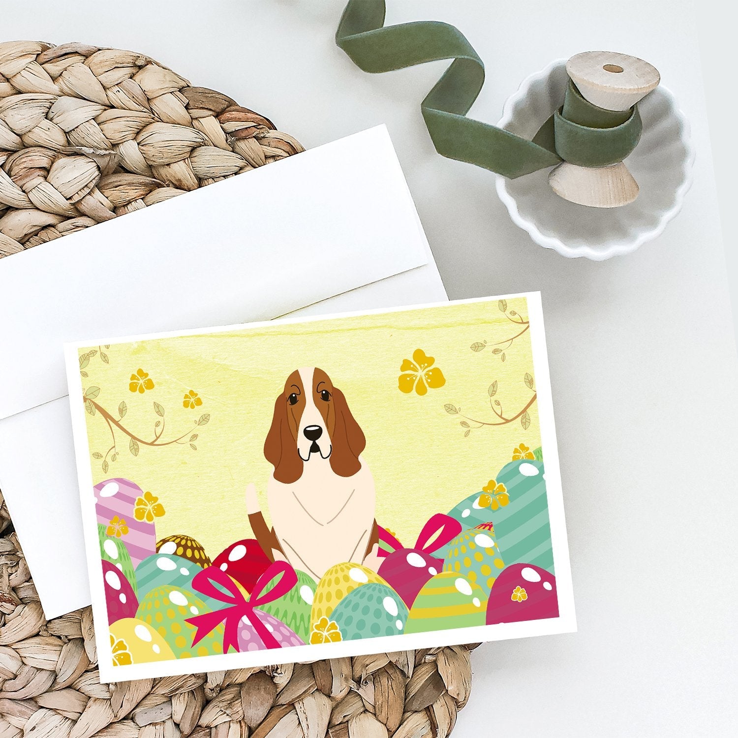 Decorate your space with our Easter Basset Hound artwork on a . Celebrate special moments with Caroline's Treasures Printed Greeting Card Pack. This pack includes eight beautifully folded 5x7 cards, accompanied by eight matching white envelopes. With blank interiors, these cards provide ample space for your personalized messages and heartfelt holiday greetings. Each card features captivating full-color artwork, meticulously printed in our facility on high-quality 80 lb cover stock or 216 GSM. The super smooth finish of the white cards enhances the visual impact of the artwork, creating a truly stunning presentation. Designed by our talented in-house artists or licensed artists, the artwork on these cards showcases their creativity and attention to detail. From vibrant illustrations to captivating designs, each card tells its own unique story. Whether it's for birthdays, anniversaries, holidays, or any special occasion, Caroline's Treasures Greeting Card Pack is the perfect way to convey your heartfelt sentiments. Share joy, love, and warm wishes with these exquisite cards and make every moment unforgettable.
