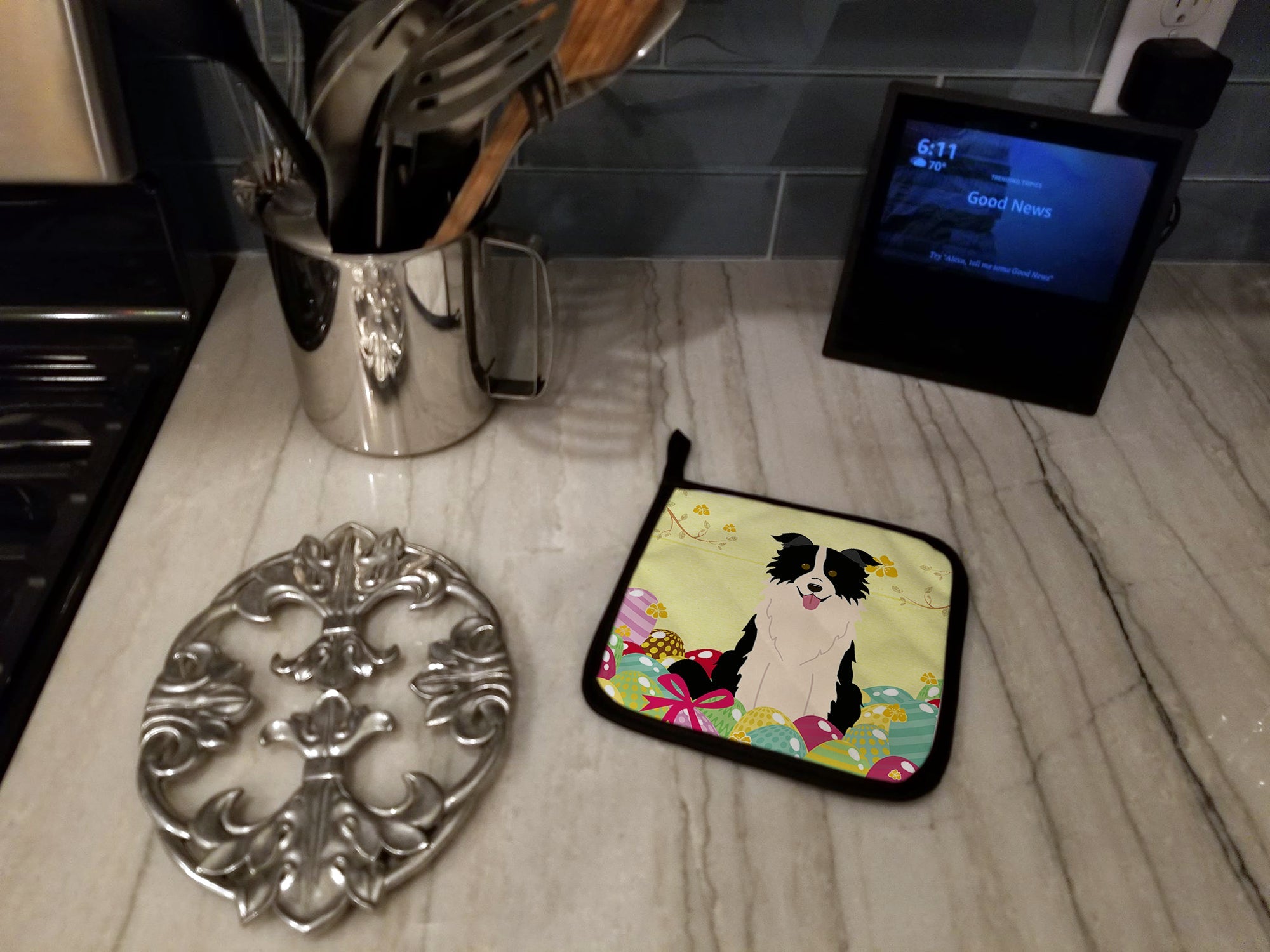 Decorate your space with our Easter Border Collie artwork on a Pair of Pot Holders. A Pair of Pot Holders to match your kitchen decor. Made in the USA these are thick and functional. Full color artwork decorates the front polyester fabric of the hot pad and accented by a black trim. Use these at as a trivet for your Thanksgiving or Christmas tablescape. Filled with insulated fabric and quilted for durability. These colorful pot holders will make a great gift for your favorite home cook or executive chef. Each pot holder measures approximately 7 1/2 inches by 7 1/2 inches. A hanging tab is included.