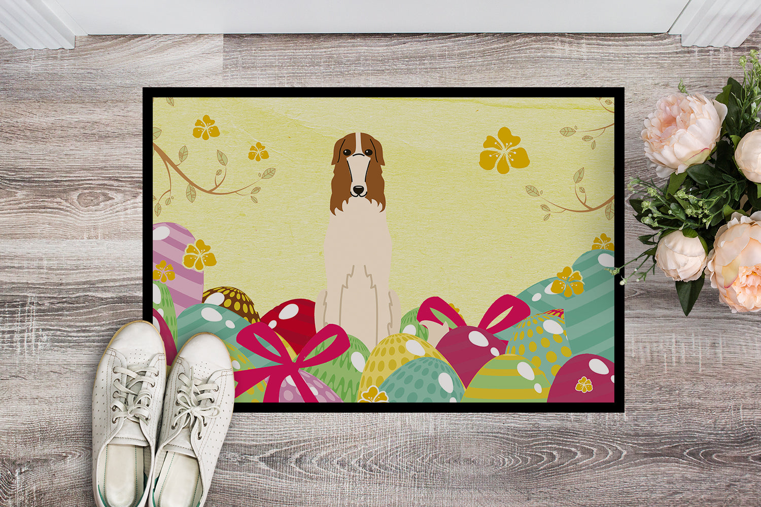 Decorate your space with our Easter Borzoi/Russian Wolfhound artwork on a Doormat. Welcome your guests in style with our Artwork Door Mat, designed to withstand almost any weather condition. This mat, measuring approximately 24 by 36 inches, is held together by durable black binding tape. Its top layer, composed of polyester felt, is dyed with the eye-catching image you see on the mat. A few layers below provide the mat with stability, while its rubber bottom is stamped to help prevent slipping and ensures safety. Our mat works wonderfully as both an indoor or outdoor door mat. For cleaning, simply hose it off with water or use a power washer - no need for any cleaner that produces suds. Avoid scrubbing with a brush, instead, opt for the vacuum on floor setting. Designed manufactured and printed in the USA, this mat is a perfect addition to your porch, outdoor kitchen, entryway, or any indoor space. Its unique design makes it a charming decorative rug that greets your guests and adds a stylish touch to your home decor.