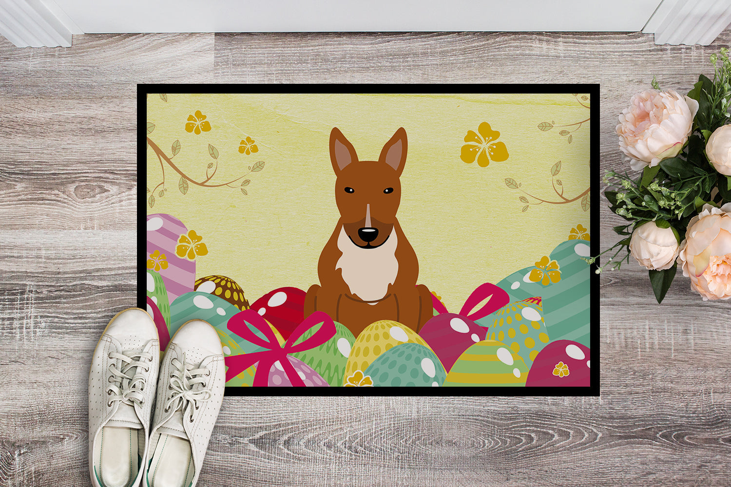 Decorate your space with our Easter Bull Terrier artwork on a Doormat. Welcome your guests in style with our Artwork Door Mat, designed to withstand almost any weather condition. This mat, measuring approximately 24 by 36 inches, is held together by durable black binding tape. Its top layer, composed of polyester felt, is dyed with the eye-catching image you see on the mat. A few layers below provide the mat with stability, while its rubber bottom is stamped to help prevent slipping and ensures safety. Our mat works wonderfully as both an indoor or outdoor door mat. For cleaning, simply hose it off with water or use a power washer - no need for any cleaner that produces suds. Avoid scrubbing with a brush, instead, opt for the vacuum on floor setting. Designed manufactured and printed in the USA, this mat is a perfect addition to your porch, outdoor kitchen, entryway, or any indoor space. Its unique design makes it a charming decorative rug that greets your guests and adds a stylish touch to your home decor.