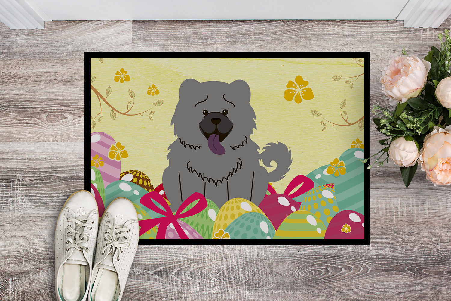 Decorate your space with our Easter Chow Chow artwork on a Doormat. Welcome your guests in style with our Artwork Door Mat, designed to withstand almost any weather condition. This mat, measuring approximately 18 by 27 inches, is held together by durable black binding tape. Its top layer, composed of polyester felt, is dyed with the eye-catching image you see on the mat. A few layers below provide the mat with stability, while its rubber bottom is stamped to help prevent slipping and ensures safety. Our mat works wonderfully as both an indoor or outdoor door mat. For cleaning, simply hose it off with water or use a power washer - no need for any cleaner that produces suds. Avoid scrubbing with a brush, instead, opt for the vacuum on floor setting. Designed manufactured and printed in the USA, this mat is a perfect addition to your porch, outdoor kitchen, entryway, or any indoor space. Its unique design makes it a charming decorative rug that greets your guests and adds a stylish touch to your home decor.