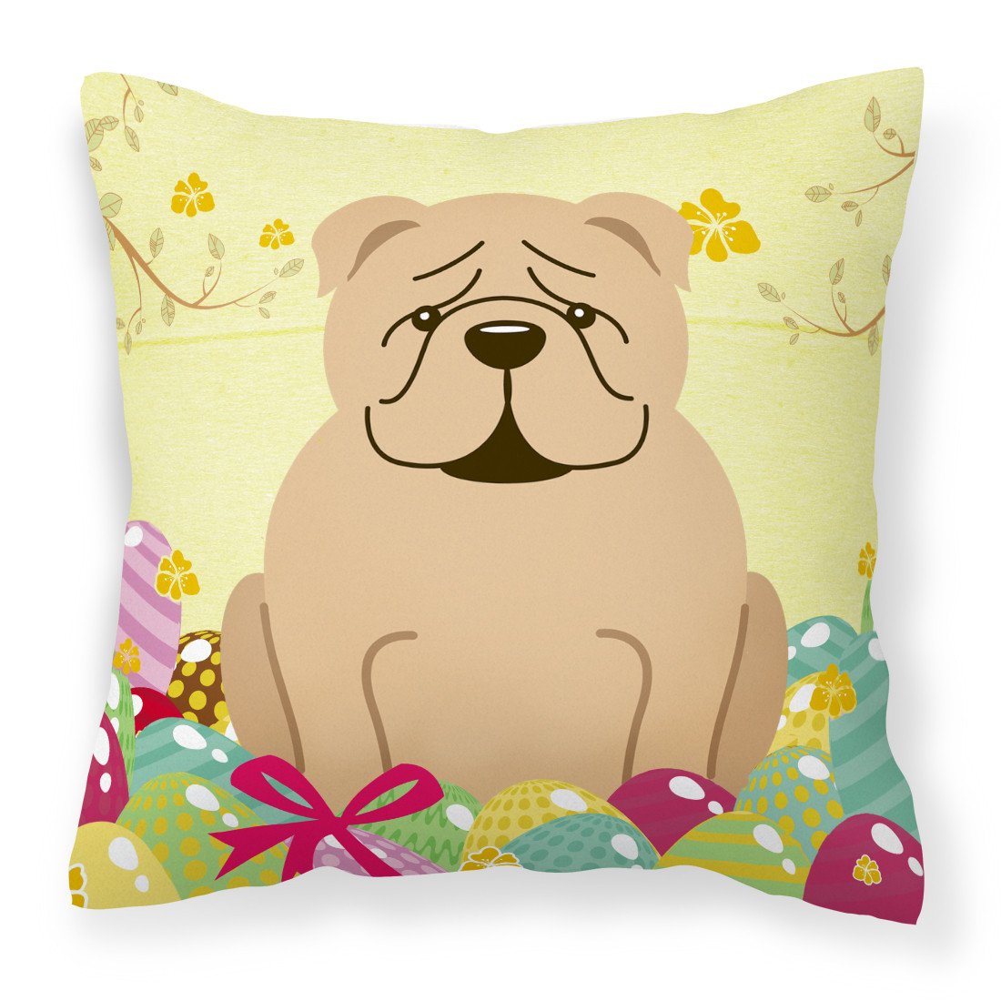 Decorate your space with our Easter Bulldog, English Bulldog artwork on a Pillow. Revitalize your outdoor or indoor living space with Caroline's Treasures 18x18 Fabric Decorative Pillow. With a generously sized dimension of approximately 18 inches by 18 inches, this pillow makes a comfortable and aesthetic addition to any seating area. Made from a unique, water-resistant material developed by Caroline's Treasures, the pillow sham is 100% polyester fabric that's durable and ready to weather any condition. Its vibrant, full-color artwork will not fade over time as it is dyed with color-fast dyes. Whether you place it on your patio furniture, porch, veranda, or indoor couch, its soft canvas fabric ensures a cozy experience. The pillow is handcrafted in the United States, featuring a sham created from three pieces of fabric and a polyester insert for enduring shape and overstuffed comfort. Despite being robustly built to endure the outdoors, it is as soft and snug as your favorite indoor cushions. Please note, as all our pillows are handmade, sizes may vary slightly, adding to the charm of this unique decorative item.