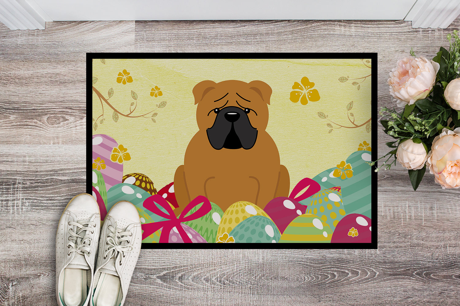 Decorate your space with our Easter Bulldog, English Bulldog artwork on a Doormat. Welcome your guests in style with our Artwork Door Mat, designed to withstand almost any weather condition. This mat, measuring approximately 18 by 27 inches, is held together by durable black binding tape. Its top layer, composed of polyester felt, is dyed with the eye-catching image you see on the mat. A few layers below provide the mat with stability, while its rubber bottom is stamped to help prevent slipping and ensures safety. Our mat works wonderfully as both an indoor or outdoor door mat. For cleaning, simply hose it off with water or use a power washer - no need for any cleaner that produces suds. Avoid scrubbing with a brush, instead, opt for the vacuum on floor setting. Designed manufactured and printed in the USA, this mat is a perfect addition to your porch, outdoor kitchen, entryway, or any indoor space. Its unique design makes it a charming decorative rug that greets your guests and adds a stylish touch to your home decor.