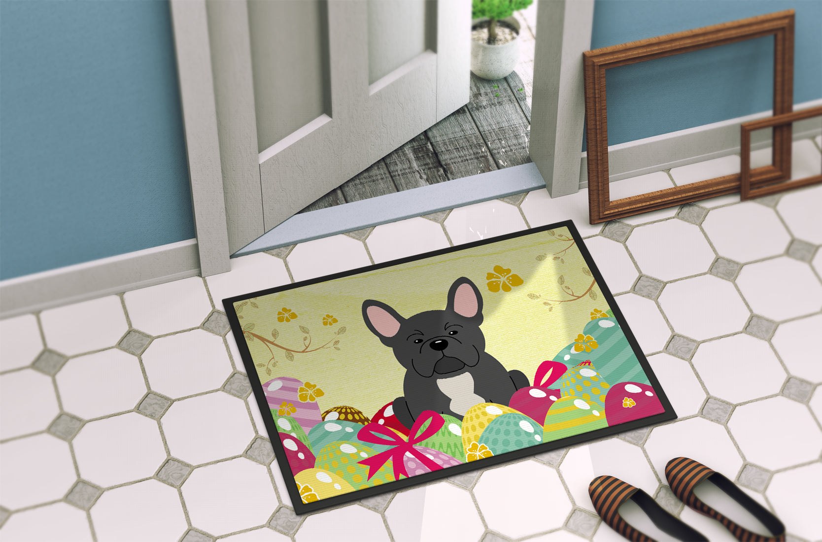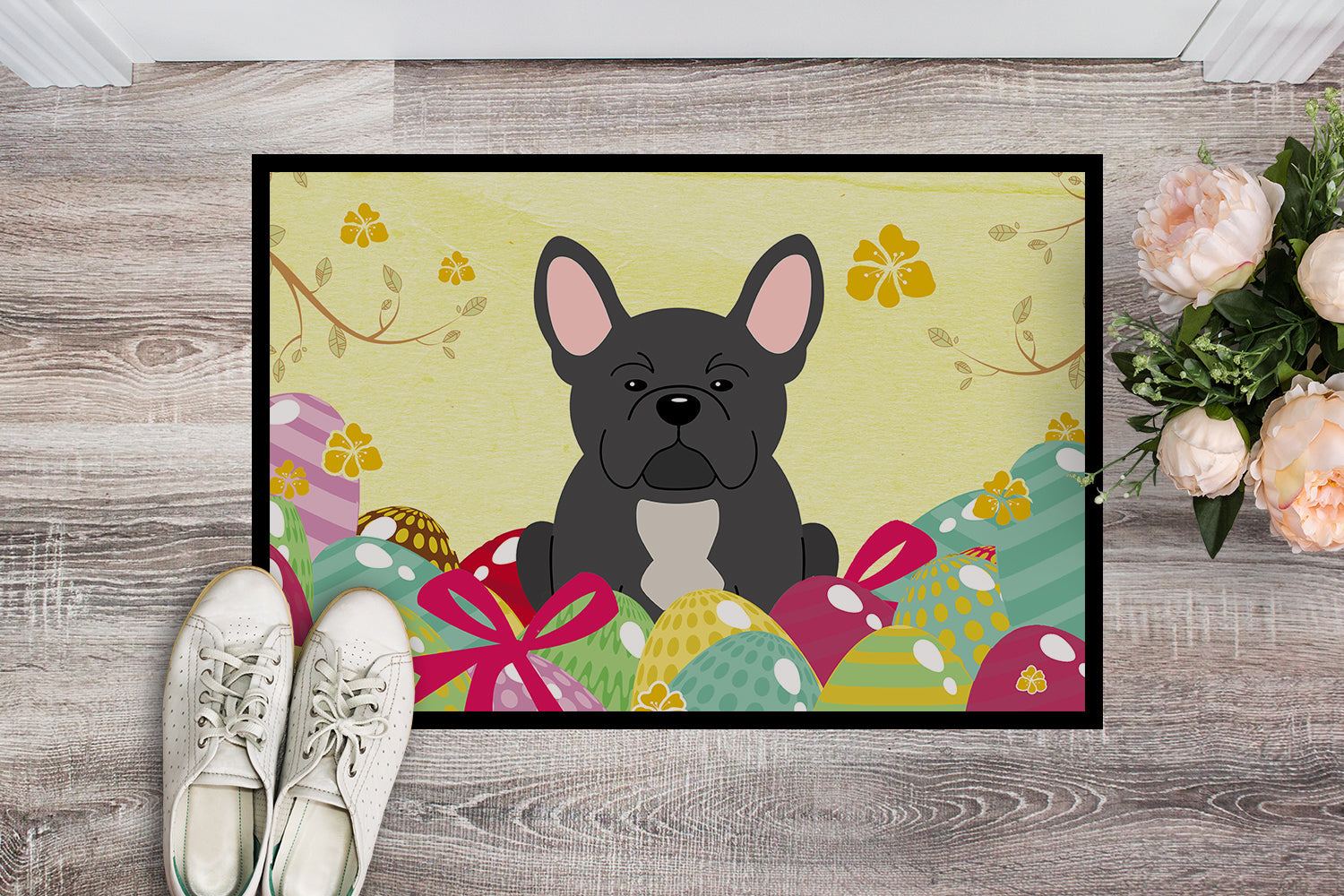 Decorate your space with our Easter French Bulldog artwork on a Doormat. Welcome your guests in style with our Artwork Door Mat, designed to withstand almost any weather condition. This mat, measuring approximately 18 by 27 inches, is held together by durable black binding tape. Its top layer, composed of polyester felt, is dyed with the eye-catching image you see on the mat. A few layers below provide the mat with stability, while its rubber bottom is stamped to help prevent slipping and ensures safety. Our mat works wonderfully as both an indoor or outdoor door mat. For cleaning, simply hose it off with water or use a power washer - no need for any cleaner that produces suds. Avoid scrubbing with a brush, instead, opt for the vacuum on floor setting. Designed manufactured and printed in the USA, this mat is a perfect addition to your porch, outdoor kitchen, entryway, or any indoor space. Its unique design makes it a charming decorative rug that greets your guests and adds a stylish touch to your home decor.